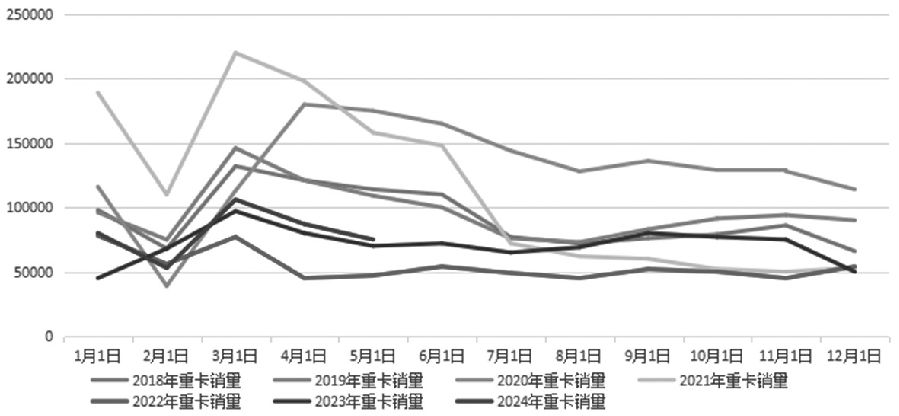 图为2013—2024年国内轮胎产量走势(单位:万条) 在我国高性价比轮胎畅销海外的背景下,轮胎企业开工率维持偏高水平。据统计,二季度,国内轮胎企业半钢胎开工负荷均值为79.38%,较一季度开工率均值73.37%大幅回升6.01个百分点,较去年同期的73.82%大幅回升5.56个百分点。不过与半钢胎高开工率形成反差的是,国内全钢胎开工率表现乏力。据统计,二季度,我国山东地区轮胎企业全钢胎开工负荷均值为61.03%,较一季度开工率均值59.18%小幅回升1.85个百分点,较去年同期的65.46%小幅回落4.43个百分点。这主要因为国内部分地区基建表现不佳,与之相关的运输量下滑影响轮胎生意,从而诱发工程类重卡需求出现下滑。 [重卡销量同比、环比出现萎缩] 受前期供应链上下游需求集中释放和部分地区需求动力偏弱等因素影响,5月,中国物流业景气度指数为51.8%,较4月回落0.6个百分点。由于物流业景气度和国内重卡运输相关性较高,受此影响,作为天然橡胶需求的“晴雨表”——重卡销量在5月同比和环比双双回落。据统计,5月,我国重卡汽车销量约7.5万辆,环比大幅下降9%,较去年同期的7.74万辆也小幅下滑了3%。累计来看,1—5月我国重卡汽车销量约43万辆,虽然较去年同期增长7%,不过累计增速却较1—4月有所下滑。 导致重卡汽车销量增速下滑的原因:一是过去几年国内重卡汽车销量增速较快,基数较高,导致今年销量增速出现下滑;二是国内房地产表现较弱,导致地产衍生行业依然疲弱,重卡增量需求较低,只能依靠存量更新来支撑销量。在重卡销量增速下滑的拖累下,沪胶期货缺乏需求驱动助力。