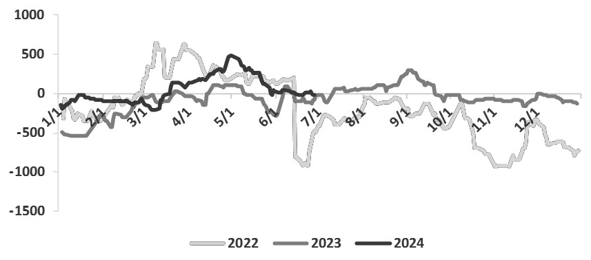上周,受某外轮装载甲醇船货(约2万吨)的船只从太仓改港发往乍浦的市场消息刺激,甲醇期货主力合约大幅上涨,但由于该船甲醇是供MTBE等终端使用的,浙江前期停车的MTO装置目前暂未有重启计划,市场对MTO装置的重启预期落空,甲醇主力合约涨势有所放缓。此外,天津渤化60万吨/年MTO装置受园区事故影响停车,港口库存大幅累积等因素同样对甲醇期价产生了较大压制作用。 [内地春检基本结束] 今年甲醇装置春季检修力度明显不及往年。一方面,由于大量装置已经在2023年第四季度和2024年年初进行过检修,另一方面,更重要的原因是今年以来煤制甲醇的生产利润尚可,甲醇生产企业现金流成本压力一直不大,在煤制甲醇生产利润较好的情况下,上游厂家的春检意愿不强,一定程度上限制了整体的检修力度。 近期,随着内地甲醇价格的连续回落,以及煤炭价格的偏弱运行,以完全成本计的煤制甲醇生产利润已经收窄至盈亏平衡线附近,但同比仍处于高位水平,现金流方面也无太大成本压力。当前内地春检已经基本结束,前期停车检修的装置也于近期逐步恢复生产,供应端较为充裕。 [进口量有提升预期] 甲醇月度进口量或重回120万吨以上,美国对阿联酋的制裁影响相对可控。上半年伊朗和非伊甲醇装置整体运行情况不佳,出口到中国的甲醇数量下降明显。首先,一般情况下,冬季限气停车的伊朗甲醇装置应该在2024年一季度逐步恢复生产,但受寒潮天气、天然气供应不稳定以及装置临时停车等因素影响,伊朗甲醇装置实际重启速度偏慢,直到二季度末才得以全面恢复。其次,4月下游MTO工厂与伊朗供应方关于进口计价方式的谈判僵持,以及5月中上旬国际海运运力吃紧等因素对我国进口甲醇也产生了一定影响。再次,2024年上半年,印度地区的甲醇消费延续2023年的向好态势,当地可见伊朗的船货增加,分流了部分发往中国的货量。最后,5月初北美Natgasoline、东南亚马石油Petronas和文莱BMC等甲醇装置相继出现长时间停车检修,5月底南美特巴甲醇装置因天然气供应问题降负,二季度末非伊甲醇装置整体开工率下行较为明显。