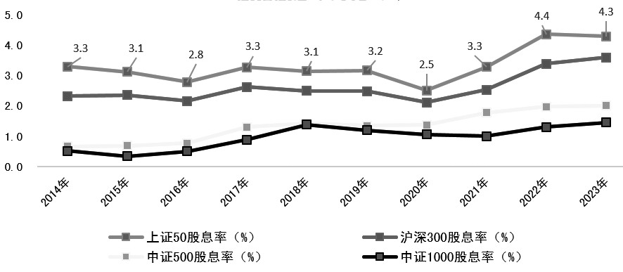 图为申万一级行业涨跌幅(单位:%) 目前我国各类资产回报有所回落,房地产价格仍在调整中,从5月数据来看,资金在资产配置上可选择性下降,现阶段更多是寻求确定性。4月10—19日,2024年储蓄国债(电子式)第一期和第二期正式发行,两期合并最大发行额450亿元,短时间内被一抢而空。从利率看,多轮调降后,本轮发行的储蓄国债3年期、5年期利率均未突破2.5%,但相比银行存款而言仍具有较大优势。 对比之下,高息股也具有类债券特性,有一定稀缺性,能提供相对稳定的盈利。我们统计了2014年以来上证50、沪深300、中证500和中证1000四个品种的分红情况,其中上证50指数自2022年开始股息率在4%以上,若不考虑股价波动因素,能够带给投资者较高的确定性收入,分红率相对较低的中证1000在2023年股息率为1.5%,低于国债等无风险利率,资金在投资这些板块时仍会有较大顾虑。从实际资金流向看,中证红利ETF(515080)已经连续14日连续净申购,区间累计净流入资金4.79亿元,近60日净流入额则增至近10亿元。