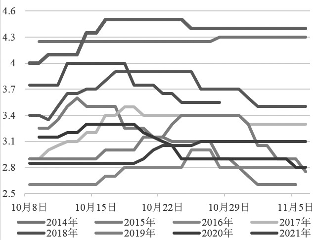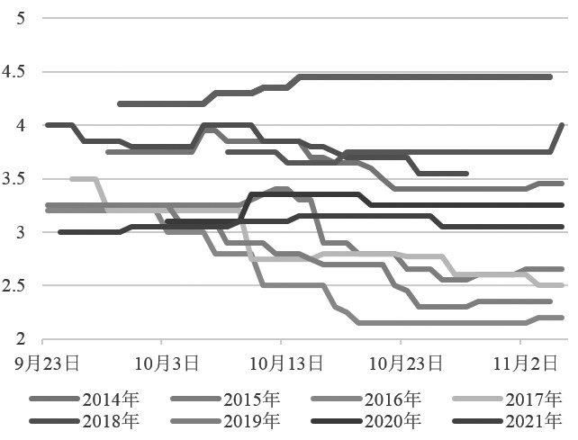 图为栖霞富士80#一二级收购价(单位:元/斤) 假设新季苹果平均收购价在历年平均价格2.7~3.2元/斤,此价格对比当前库存价格仍偏高,或使苹果进入富有弹性阶段,对消费有抑制作用。去库存压力凸显,后期苹果或延续跌势。 假设新季苹果平均收购价低于2.7元/斤,甚至低于2.5元/斤,较低的价格或使得苹果消费趋好,去库压力减轻,后期苹果有望扭转颓势。