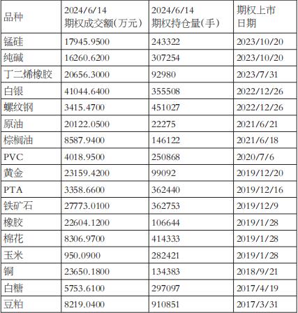 [期权平价套利策略的研究内容] 我们将研究时间定在每个品种上市后一个月,即上市首月。出于可操作性,选取2024年6月14日成交额与持仓量较高的品种进行研究。选定的17个品种包括:锰硅、纯碱、丁二烯橡胶、白银、螺纹钢、原油、棕榈油、PVC、黄金、PTA、铁矿石、橡胶、棉花、玉米、铜、白糖和豆粕。这些品种在期权成交和持仓方面均表现活跃。