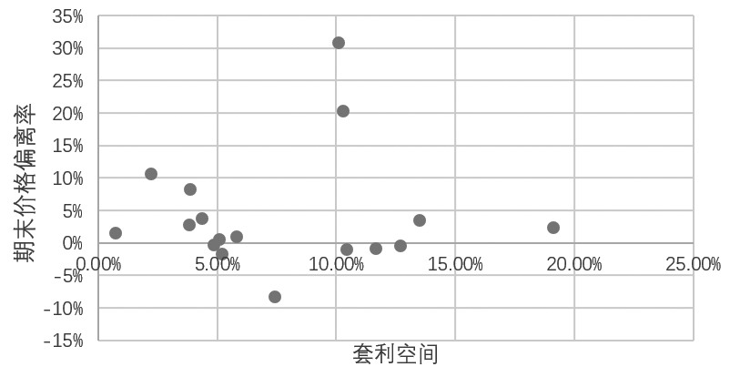 图为加杠杆后的波动率与套利空间的关系 期末价格偏离率(月度涨跌幅):通过数据测算发现,期末价格偏离率与平均年化收益率呈很弱的正相关关系,故该因素的影响并不明显。