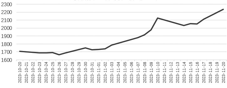 表为筛选后的17个商品期权品种活跃度及其上市日 平价套利基于期权平价公式的一价原理。平价公式为:C+Ke-rT=P+S,其中C和P分别为看涨和看跌期权价格,K为行权价,S为标的物现货价格。我国商品类期权绝大部分为商品期货期权,即以商品期货为标的物的期权。因此,实施平价套利时,现货价格S由期货价格F进行代替。在期货市场中,F理论价格等于S×erT。因此,可以直接把平价公式简化为:C+K=P+F。当某一时刻,公式两边不相等时,便存在套利机会。 以纯碱期权为例,上市日为2023年10月20日,首个标的月份为2401。期权上市首月,纯碱2401期货价格呈上升趋势。