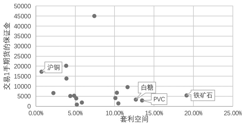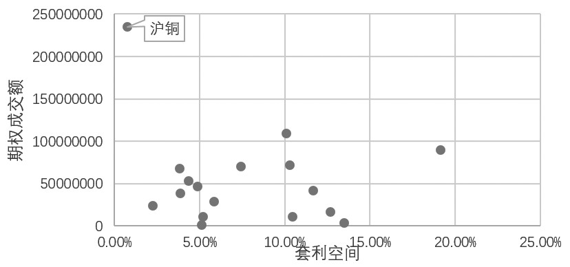图为资金占用与套利空间的关系 资金占用:从成本角度分析,资金占用作为收益率的分母端,直接影响整体收益率。直观来看,资金占用越大,收益率越低。在实际操作中,平价套利需要做多或做空期货合约,卖出看涨或看跌期权所需的保证金也与期货保证金高度相关。从结果来看,资金占用与平均年化收益率呈负相关关系,相关系数为-0.2257,除去极端值后相关性更为明显。在17个样本品种中,平均年化收益率最低的是铜,而其资金占用排名第三。铁矿石、PVC、白糖等套利空间较大的品种,交易时的资金占用均处于较低水平。 期权成交额:成交额越高,意味着流动性越好,套利空间越容易被抹平。当成交额较低、流动性不足或者市场容量较小时,比较容易出现定价偏差。此外,套利空间较大,也会吸引套利交易者,反过来促进成交。截至2022年,交易境内期权以套利为目的的投资者占比近20%。因此,理论上,期权成交额与套利空间呈反向趋势。从测算结果来看,二者相关系数为-0.1940。铜期权上市首月,成交额高达2.3亿元,当期,其平均年化收益率仅为0.74%。