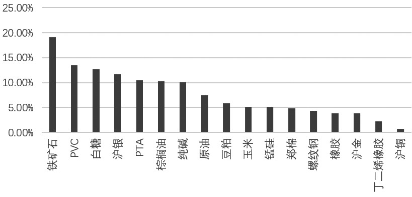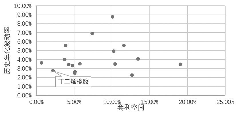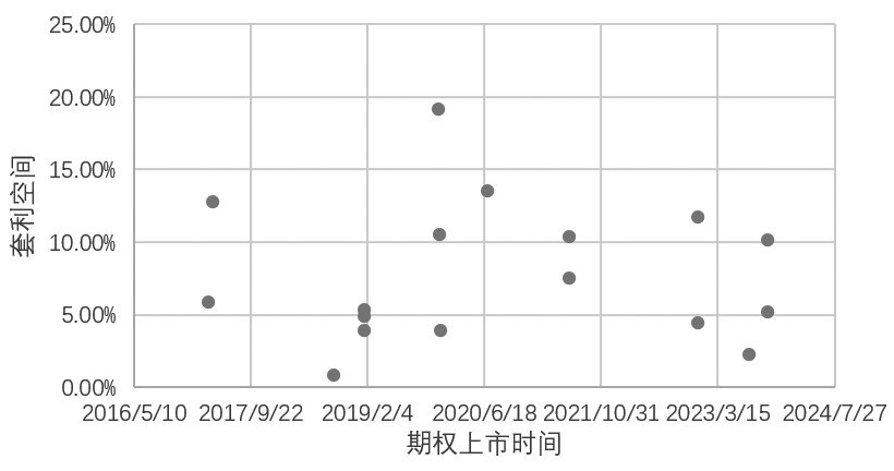 图为期权上市时间与套利空间的关系 期权上市时间:我国首个场内期权是上证50ETF期权,其在2015年2月9日上市;首个商品期权是豆粕期权,其在2017年3月31日上市。经过实际数据对比发现,我们选择的17个样本品种中,平价套利空间与上市时间并无明显的线性相关关系。究其原因,商品期货期权2017年上市,有前期ETF期权运作的经验,监管制度较为严格与完善,加上市场准入条件较为严格,以至于单纯在时间维度上,商品期权近几年的平价套利机会并无明显变化。 标的波动率:期货标的波动较大,期权平价套利机会出现的概率增加。我们将样本中各个期权在上市首月标的期货合约的年化波动率进行比较,可以发现,其与平均年化收益率呈弱正相关关系,相关系数为0.1445。比如,丁二烯橡胶期权上市首月,标的期货合约年化波动率为2.72%,同期平均年化收益率为2.23%,处于较低水平。其余平均年化收益率比丁二烯橡胶高的15个品种,有12个年化波动率同样较高。值得注意的是,散点图呈喇叭状发散,意味着波动率越大,品种的套利空间分化越明显;波动率越小,品种的套利空间越集中。