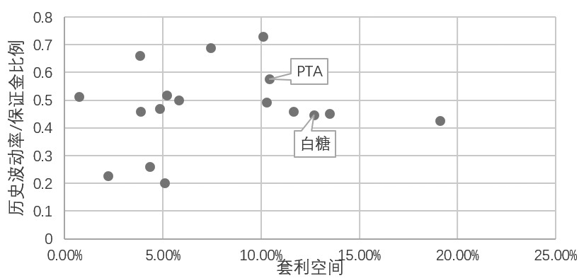 图为期货合约波动率与期权套利空间的关系 波动率/保证金比例:期货具有杠杆属性,标的合约波动率会通过杠杆放大。因此,投资者账户实际风险应通过波动率除以保证金比例去衡量。通过分析不同品种波动率/保证金比例与平均年化收益率的关系,发现相关系数从上文的0.1445略微提升至0.15。最为明显的例子是白糖,其期权上市初期标的期货波动率并不高,仅为2.23%,是样本内所有品种标的期货中波动率最低的,却拥有排名第三的套利空间。通过杠杆调整,波动率/保证金比例为0.45,接近平均值。同样,PTA期权上市初期,标的期货波动率为3.45%,处于靠后的水平,却拥有排名第五的10.45%的平均年化收益率,同期波动率/保证金比例为0.57,排名第四。期货具有杠杆属性,使用保证金比例对波动率进行调整后去衡量套利机会,比单纯使用波动率更加合理。