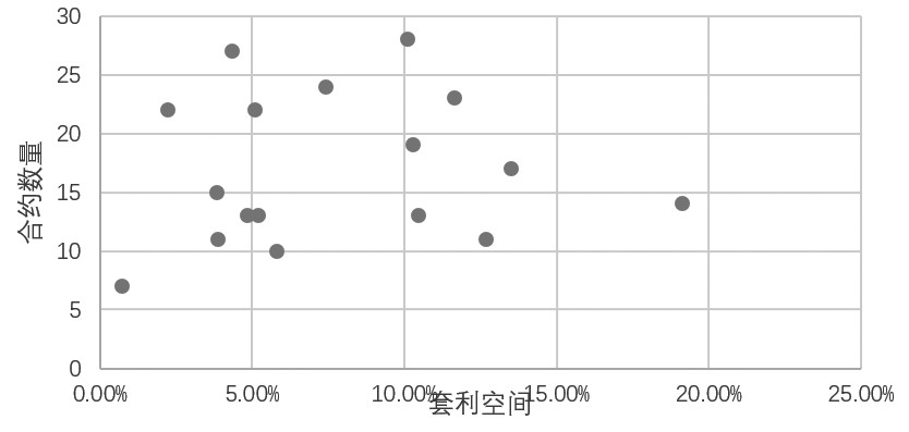 图为期权成交额与套利空间的关系 行权价格数量:某一品种固定月份的行权价格数量越多,其合约数量越多。理论上,由于总量资金不变,合约数量多会分散资金分布,降低合约流动性,进而间接影响该品种期权的套利机会。然而,我们以某品种上市时近月合约的行权价格数量为例,测算结果并未显示其与套利空间具有明显的相关性。套利空间受到各种因素影响,行权价格数量的影响实际上并不大。