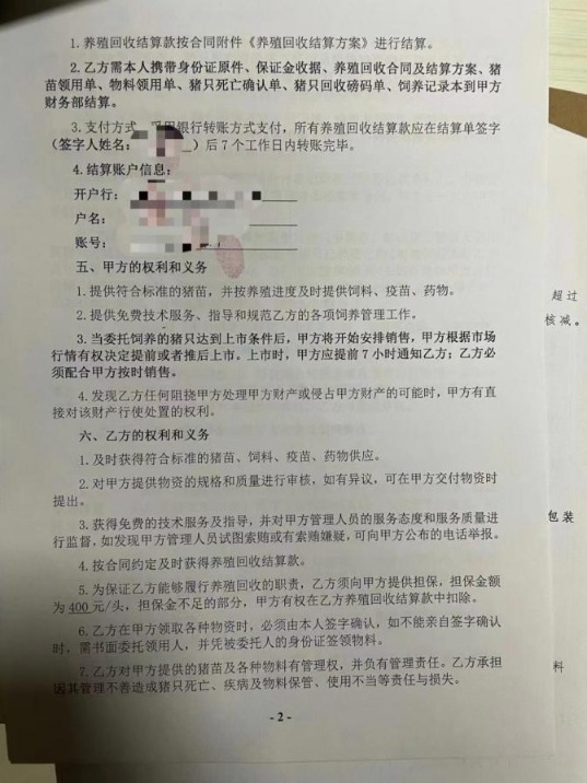 | 7月中旬的一个上午,李江驱车40多公里,到南宁市运回了一车饲料,在此之前,李江代养的正邦科技(002157.SZ)育肥猪已经两天没吃饲料了。 “正邦老是断料,供几天料就断个两三天已成为常态,”李江向财联社记者表示,“拿不到饲料猪会生病、会饿死, 我是绝对不会垫饲料钱的,断料就断料吧。” 据财联社记者多地了解,最近一个月,不仅是李江所在的广西南宁,四川江油、江西赣州、湖南湘潭等多地的正邦科技代养户均出现不同程度的断料问题,并且还面临结款难、退押金难等多重问题。 正邦科技资金链持续紧绷,正在波及代养户手上的生猪。据财联社记者测算,如果正邦科技“公司+农户”业务依然正常运转,以2021年数量相当的生猪出栏量估算,下半年该部分业务将给公司贡献收入超80亿元,利润逾10亿元。 在行业周期上行之时,面临生猪饿死、减重,承担后果的,必然不仅是代养户。 代养户面临“断料” 断料是正邦科技代养户面临的首要问题。 7月3日,抖音用户“雪中泪”发布视频称,断料8天后,正邦科技代养户代养的猪在极度饥饿的情况下,出现猪吃猪。 随后,猪吃猪视频被全部删除,“雪中泪”回复财联社记者称:“当地政府正在和正邦谈判,帮忙解决问题,就先删了视频。” 到了7月8日,“雪中泪”再次发布猪吃猪视频,且截至发稿未再删除。财联社记者询问为何二次发布视频,“雪中泪”未再回复。 对于猪吃猪,正邦科技某分公司财务负责人袁复昌的反应十分平静,他在记者暗访时分析称:“猪吃猪明显是缺饲料,公司资金紧张,没法提供饲料,没办法,饲料缺久一点,就会出现猪吃猪的情况。” 而资金紧张导致断料并非个例。在财联社记者调查过程中,广西南宁、江西赣州、四川江油、湖南湘潭等地的正邦科技代养户均出现不同程度的断料问题。 原正邦科技四川地区销售经理杨定告诉财联社记者,“我原来负责饲料这一块,公司没有资金,没钱买原材料,代养户断料很正常的。我的工资才发到4月份,养殖户的饲料哪能稳定供应?” ![]() (代养户的养猪场图片来源:受访者提供) 正邦科技供料中断后,由于权责划分,代养户即使看着猪挨饿至饿死,也不愿垫款购买饲料。 某代养户向财联社记者提供的双方协议显示,正邦科技以记账的方式提供猪苗、饲料、药物、疫苗等物料,代养户提供养殖场地、设施与劳动力,正邦科技向农户支出的代养费标准为1.5元/头/天,所有物料及肉猪均属正邦科技财产。 按照合同约定,代养户购买饲料,喂养的是正邦科技的猪,饲料款相当于暂借予正邦科技。在正邦科技资金紧张无法保证供料后,代养户普遍不愿垫款购买饲料。 山西吕梁代养户王伟就曾替正邦科技垫资,他对此十分愤怒,“我垫款之后,正邦把猪拉走一批,然后一句话都没,不仅不给结算,也不说垫款的事。后来我就和正邦闹翻了,最后一批猪我养了半个月,公司也不送饲料,也没药,猪死在猪圈里都没人管。” 对于不垫款导致猪饿死或猪吃猪,华北地区某养殖农户告诉财联社记者:“别人卖的东西是物件,但养猪人卖的猪是生命,卖了以后猪进入屠宰场就会被杀,我们说自己赚的钱都是杀生得来的,是‘发血财’,对猪会有愧疚,一般都会尽量对猪好一些,眼睁睁看着猪饿死或者猪吃猪,对养猪的人来说,很不好受。” 内心虽有挣扎,但在资金压力下,代养户不得不直面现实。江西赣州代养户张豪对记者表示,“我代养的2000头猪让正邦卖了之后,让我向公司打申请给我结款,但就给我结60块一头,水电费都不够,我养了6个半月,一头应该是300块代养费的。” 对于结款难,正邦某分公司财务负责人袁复昌表示正常,他告诉记者:“我的工资都还在拖欠,农户合作的钱更难给,比如说400万的就先给100万,后续的看情况了,毕竟我不是不给,只是一下没那么多钱,农户也没办法。” 关于代养费纠纷如何解决,张豪称:“走法律程序赢是能赢,但搞得很麻烦,关键是赢了也没钱。现在要想办法搞他,我之前天天去闹,每天准时打卡,比上班都准,直接拿上锁,锁住他们的门,锁了几次才说给我解决问题,但解决了也没用,最后说没钱,还是只给你这么多,太糟心了。”据了解,与张豪有代养费纠纷的服务部为正邦科技赣州市信丰县服务部。 ![]() 生猪面临“偷卖” 出于对正邦科技资金链的担忧,代养户正陆续退出代养合作,但退出的过程并不容易,结款和退押金成为难题。 陕西临汾代养户卢娟对能否讨回押金较为担心,正准备起诉。她告诉财联社记者:“养殖结束以后,代养结算款没给全不说,6万元押金一分没退,去年12月结算退的户,现在6月了,连个人都联系不上,想打官司都找不到人,当地的服务部都搬没影了,人去楼空。我现在准备起诉,打算连当时服务部的会计一起起诉,没办法,正邦没联系人,只能拉这个会计下水。” 山西吕梁代养户刘文面临的情况与卢娟类似,他表示:“我和正邦合作代养了600头,该出栏的时候,正邦来人把猪拉去卖了,结果猪卖了代养费结了,6万的押金要不回来了。现在当地的服务部撤走了,本地的代养户根本联系不上原来接触的正邦任何一个人,打总部电话说不归他们管,建议我们走司法程序。我觉得我们这一批代养户的钱是要不回来了。” 面对结款与退押金困难,不少手上还有猪的代养户冒险“无奈”选择“偷卖”公司猪。 曾替正邦垫资的山西吕梁养殖户王伟在维权群里劝其他代养户:“现在有猪的能