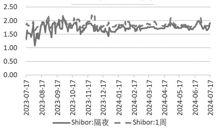 7月,国债期货整体高位盘整。截至7月17日收盘,2年期、5年期、10年期、30年期品种9月合约累计涨跌幅分别为0.04%、0.07%、0.11%、-0.37%。现券市场上,截至7月17日,1年期国债收益率为1.53%,较6月底下降两个基点;10年期国债收益率为2.25%,较6月底上升4个基点。资金利率平稳,流动性无忧,最新的隔夜和7天期上海银行间同业拆借利率(Shibor)分别为1.91%和1.89%。