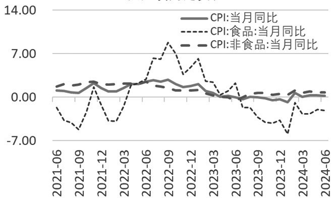 图为CPI及分项同比变化(单位:%) 物价方面,6月,国内CPI同比涨幅为0.2%,前值为0.3%,环比涨幅为-0.2%。食品分项同比涨幅为-2.1%,环比涨幅为-0.6%。其中,猪肉、鸡蛋、菜价格环比涨幅分别为11.4%、1.5%、-7.3%。去产能及消费恢复等因素作用下,生猪价格回升,而蔬菜、水果等受到季节性供给增加影响,价格趋弱。非食品分项同比涨幅为0.8%,环比涨幅为-0.2%。其中,旅游、家用器具、房租等细项环比增幅均弱于季节性。6月,PPI同比涨幅为-0.8%,前值为-1.4%;环比涨幅为-0.2%,前值为0.2%。房地产市场表现较弱与外部环境不确定,使得工业品总需求相对收缩,PPI同比持续负增长。受基数效应影响,PPI同比降幅收窄。