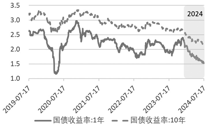 图为资金市场短端利率变化(单位:%) 今年以来,国债市场整体呈现震荡上行走势,主要原因有三:一是物价水平偏低及融资需求偏弱等因素影响金融市场投资者预期,推动债市走强;二是宏观政策强调降低融资成本,贷款、存款利率多次下调,整体利率水平下滑,债券价格上涨;三是对进行长期配置的金融机构而言,可以选择的长久期资产不多,机构都来配置长期限国债,进而推升国债价格。在国债价格走高的过程中,低利率的状况引发金融市场关注,央行多次提示长债风险。 7月1日央行公告称,将开展债券借入操作,并在7月5日确认与几家金融机构签署协议,将根据情况借入并卖出国债。部分市场人士把这个操作看作类似股票“融券”,央行借入债券,后续可以卖出,能灵活买卖,为央行通过政策调控长端利率带来更多空间。