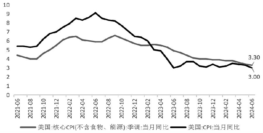 图为二季度国内GDP同比走势(单位:%) 美联储降息预期升温 影响美联储政策的核心在通胀。二季度以来,美国通胀呈现降温态势。6月,美国CPI同比增长3%,超预期回落至2023年6月以来的最低水平;环比下降0.1%,为2020年5月以来首次转负。6月核心CPI同比上升3.3%,低于预期的上升3.4%,为2022年4月以来的最低水平;环比上升0.1%,预期和前值的上升0.2%,为自2021年以来的最小涨幅。目前影响通胀下行的阻力主要来自租金项,而通胀缓解的主要贡献来自核心商品及租金以外核心服务项。6月,核心商品通胀率继续下行至-1.8%,连续6个月位于负值区间,对缓解核心通胀起主要贡献。此外,随着劳动力市场趋于饱和,6月,不含租金的服务通胀环比持平,增速为2023年5月以来低点,反映租金以外核心服务项通胀降温。由于主要居所租金和业主等价租金环比增速跌穿0.4%的平台期,租金项通胀有所松动,6月,租金项通胀同比增速回落至5.2%,通胀黏性下降。