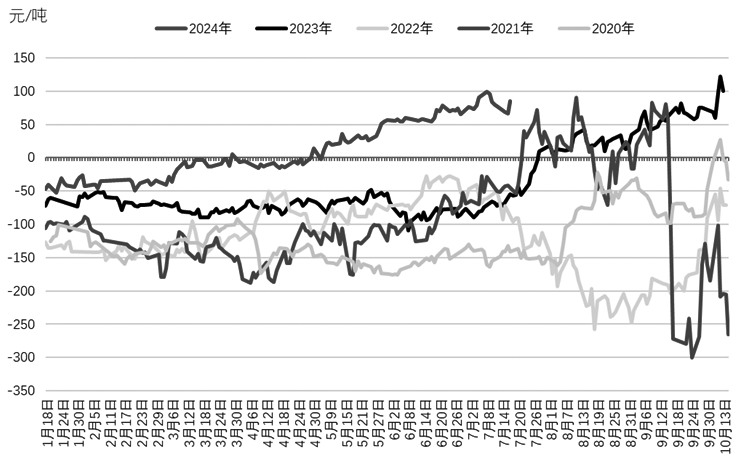 图为近5年螺纹钢期货1月与10月价差走势 综合来看,在螺纹钢维持强预期、弱现实格局不变的情况下,月间价差将继续呈远强近弱态势,且螺纹钢新国标的执行有可能为价差走扩提供额外动力,因此对2501与2410合约价差整体持看多思路。参考价差日线走势,2501与2410合约价差在50—60元/吨区间有较强支撑,后期如有回调可布局反向套利机会。(作者单位:大有期货) (责任编辑:admin) |