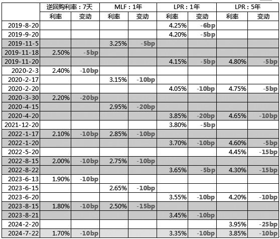 图为2019年以来政策利率及市场利率运行情况 [降息既在情理之中又在意料之外] 从以往利率调降操作模式来看,规律性较强,基本采用调整逆回购利率-调降MLF利率-调降LPR报价的系列操作,2023年8月以来出现两次MLF未调降而1年期LPR及5年期LPR分别单独调降的情况,对应着银行间流动性相对充裕、实体经济有效需求相对不足的情况。本次降息操作为逆回购利率、1年期及5年期LPR同步下调10bp,MLF利率按兵不动,对应着MLF利率政策利率色彩淡化后,LPR报价脱钩MLF利率,报价机制更趋市场化。 本次降息既在情理之中,又在意料之外。LPR报价脱钩MLF利率后进一步调降的空间被打开。6月及二季度一系列重要数据公布,表明经济延续波浪式修复的发展路径,货币政策逆周期调控的必要性仍在,降准降息概率提升。本次LPR下调10bp符合市场预期。LPR报价作为贷款利率的基准利率,其下调后作用更为直接。目前房贷利率普遍以5年期以上LPR为定价基准,且部分城市已取消房贷利率下限,新增房贷直接享受利率下调,存量房贷在重定价日作调整,有助于稳定地产市场预期。从高频数据来看,5·17地产优化调整政策效果逐步显现,二手房带看量、成交量在最近两个月有所提升,但二手房出售挂牌价格指数未见明显反转,且30城商品房销售数据仍处过去4年同期低位,此时LPR调降,有助于进一步提振地产刚性及改善性需求。