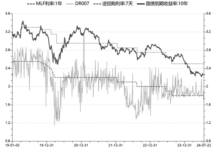 7月22日,央行发布多则公告。其一,公开市场7天期逆回购操作采用固定利率、数量招标,操作利率由1.8%调整为1.7%。其二,1年期LPR为3.35%,5年期以上品种报3.85%,均下调10bp。央行表示,自7月22日起,将LPR发布时间由每月20日(遇节假日顺延)上午9:15调整为9时。其三,为增加可交易债券规模,缓解债市供求压力,自本月起,有出售中长期债券需求的中期借贷便利(MLF)参与机构,可申请阶段性减免MLF质押品。与以往降息落地往往意味着“利多出尽”、期债短期面临显著回调压力不同,7月22日和23日,不同期限品种持续走强,30年期、10年期、5年期、2年期国债期货主力合约两日累计涨跌幅分别为0.48%、0.42%、0.31%及0.12%。 [货币政策调控框架再明晰] 6月19日,央行行长潘功胜在2024陆家嘴论坛上进行《中国当前货币政策立场及未来货币政策框架的演进》的主旨发言,明确提出进一步健全市场化的利率调控机制,未来可考虑明确以央行的某个短期操作利率为主要政策利率,目前看,7天期逆回购操作利率已基本承担了这个功能。其他期限货币政策工具的利率可淡化政策利率的色彩,逐步理顺由短及长的传导关系。 此前,每日公开市场操作的7天期逆回购利率是短端政策利率,每月投放的1年期MLF利率是长端政策利率。央行通过每日开展公开市场操作,保持银行体系流动性合理充裕,持续释放政策利率信号,使存款类金融机构质押式回购利率等短端市场利率围绕政策利率波动。同时,央行通过以常备借贷便利(SLF)利率为上限、超额准备金利率为下限的利率走廊的辅助,将短端市场利率的波动限制在合理范围。近段时间,短端市场利率围绕政策利率(7天期逆回购操作利率)中枢平稳运行,波动区间明显收窄,其对政策更为敏感,而长端市场利率处于政策利率(1年期MLF利率)下沿,一定程度上长端市场利率充分甚至过度交易了未来政策利率中枢下行的预期。在此基础上,央行提出新的货币政策框架,以7天期逆回购利率为主要政策利率,淡化MLF利率政策利率色彩,并适当收窄政策利率走廊。 新的货币政策框架构建的过程中,央行对利率调控机制的优化包括:7月初,央行公告称,将视情况持续借入并卖出国债,并明确操作方式,引导正常向上的利率曲线;7月8日,央行公告称,将视情况开展临时正回购或临时逆回购操作,临时隔夜正、逆回购操作的利率分别为7天期逆回购操作利率减点20bp和加点50bp,引出新的利率走廊,宽度较原利率走廊的245bp收窄至70bp,为市场利率运行区间提供了更为明确的引导;7月22日,央行对逆回购操作进行优化,由过去采用价格招标调整为固定利率、数量招标,即价格是给定的,明示操作利率,增强政策利率的权威性,有效稳定市场预期。