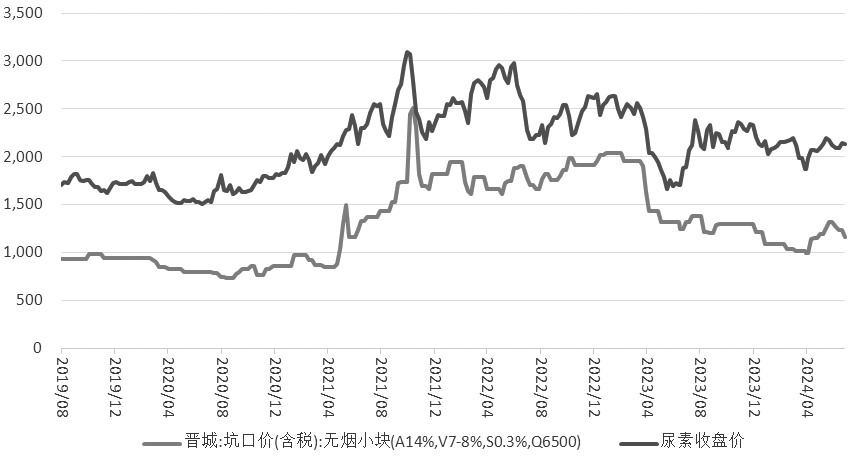 图为煤炭价格与尿素价格走势(单位:元/吨)