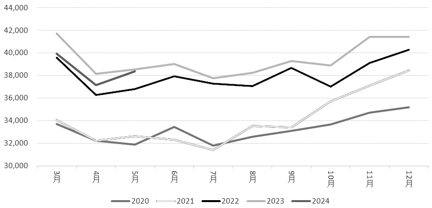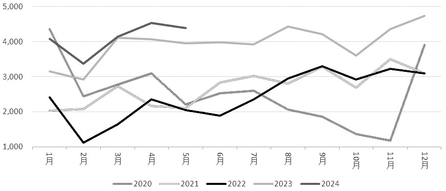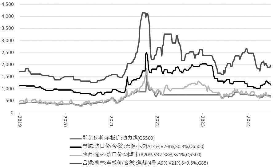 表为煤化工相关期货品种的相关性系数 从相关性统计数据能够看出,尿素期货、甲醇期货和乙二醇期货与焦煤期货的相关性系数分别为0.91、0.88、0.62,处于较高水平,基本可以印证前面分析中提出的使用焦煤期货作为煤炭市场运行的参考指标并进一步分析煤化工品种走势的逻辑。另外,从与焦煤期货的相关性系数排列顺序上来看,尿素>甲醇>乙二醇。主要原因在于,煤炭在尿素和甲醇的生产原料中所占比例较高,而在乙二醇生产原料中占比相对较低。因此,可以把焦煤价格作为尿素、甲醇这两个煤化工品种走势的重要参考指标。 从政策角度来看,煤炭作为我国基础能源,价格走势稳定是重中之重。一旦其价格发生巨大波动,反映出市场政策或者经济需求也发生了重要变化。由于期货价格具有高度的金融属性,其对经济政策和宏观形势的反应也较为敏感,并先于现货市场表现。因此,当煤炭价格出现大幅上涨或者下跌时,就容易成为主导煤化工期货品种价格走势的重要因素。从另外一个角度来看,尿素、甲醇、乙二醇三者之间的期货价格走势也具有较高的相关性,反映出煤化工品种会受共同的煤炭成本因素影响而出现共振。 2024年上半年,国内煤炭市场重心整体走弱。具体来看,1月延续僵持局面,而后受春节假日影响,下游阶段性补库,煤炭价格随之小幅上涨;进入3月,随着气温回升,居民用电量下降,终端需求疲软,煤价开始进入加速下行通道;进入5月,在铁路优惠政策助推下,下游提前备货,叠加旺季行情兑现,煤价再度掉头向上;但5月下旬之后,市场再度进入僵持弱稳局面。以鄂尔多斯动力煤为例,截至7月5日,年内累计下跌6.4%,和去年同期价格基本持平。供给方面,国家统计局数据显示,2024年1—5月国内煤炭产量18.6亿吨,同比下降3%;其中,内蒙古地区5.2 亿吨,同比增长2.7%,山西地区4.7亿吨,同比减少15%。山西减量较为明显,集团矿减量占比较大,主要受安全生产要求等因素影响。相关机构数据显示,523 家样本矿1—6月平均开工率为83.29%,同比下降12.66%。进口方面,据海关总署最新数据显示,2024年1—5月累计进口煤20497万吨,同比增长12.6%。