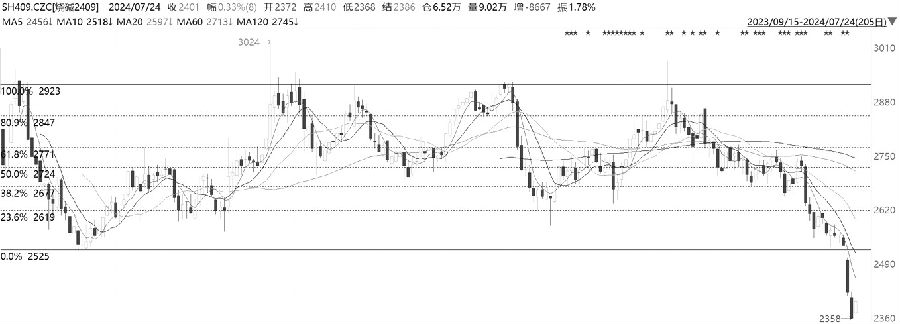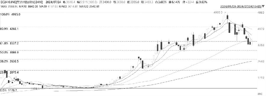 3月下旬,集运指数(欧线)期货开启了单边上涨的走势。至7月初,创出4995点的上市以来高点,之后见顶回落,并接连跌破黄金分割0.618对应的3540点和60日均线等重要支撑位。短期均线下穿长期均线,走势开始转弱。MACD指标死叉后持续发散,KDJ、RSI指标有金叉迹象,短期价格有反弹需求。量仓方面,7月24日反弹伴随着增仓放量,反弹具有动能。综上,集运指数(欧线)期货反弹伴随着量能上升,指标走强,价格有望止跌反弹。(弘毅物产 黄李强)