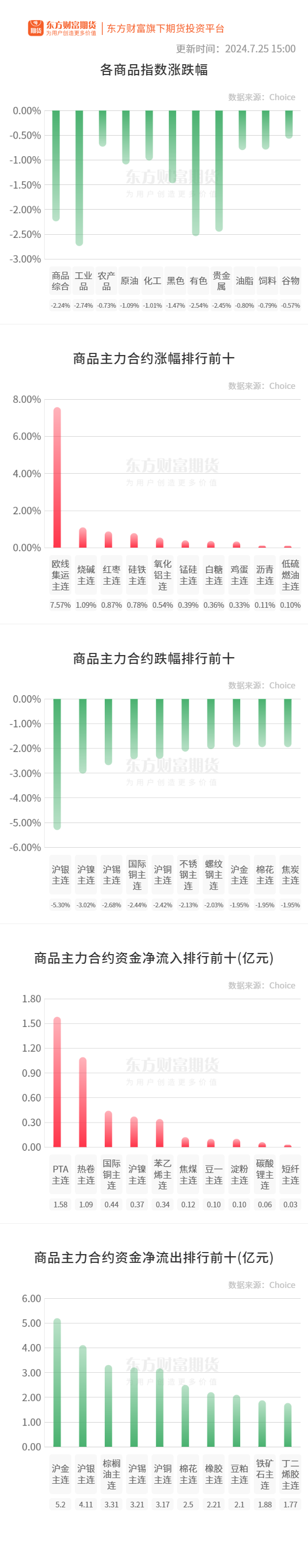 行情纵览![]() 宏观产经中国证券报:人民银行网站消息,为维护月末银行体系流动性合理充裕,7月25日人民银行以固定利率、数量招标方式开展了2351亿元逆回购操作,操作利率为1.7%。此外,以利率招标方式开展2000亿元1年期中期借贷便利(MLF)操作,中标利率为2.3%,较此前下降20个基点。 证券时报:5年期定存正式进入“1”时代。工行、农行、中行、建行等国有大行集体自7月25日起调整人民币存款利率。其中,两年期以上整存整取存款利率下调幅度最大,为20个基点。 品种资讯黑色系期货 螺纹钢:据Mysteel,截至7月25日当周,螺纹钢产量连续第四周下降,厂库由降转增,社库连续第三周减少,表需连续第二周减少。①螺纹产量216.69万吨,较上周减少6.78万吨,降幅3.03%;②螺纹厂库193.65万吨,较上周增加1.65万吨,增幅0.86%;③螺纹社库566.59万吨,较上周减少11.98万吨,降幅2.07%;④螺纹表需227.02万吨,较上周减少4.42万吨,降幅1.91%。(Mysteel) 为了积极响应国家号召,确保新旧标准的平稳过渡,并保障广大客户的利益,山钢股份决定自2024年8月1日起,正式按新标准组织生产和检验判定。届时,产品标牌及质保书将按照新标准进行变更。(Mysteel) 据SMM成本利润表看,进口矿利润小幅波动;7月24日,SMM统计的高炉开工率为93.61%,环比下降0.55%。高炉产能利用率为95.52%,环比下降0.45%。样本钢厂日均铁水产量为229.01万吨,环比下降0.94万吨。近期螺纹价格下跌幅度较大,钢厂亏损严重,部分钢厂计划在8月检修高炉,或导致铁水产量继续下滑。(SMM) 煤炭:国际能源署(IEA)在一份关于煤炭市场的最新报告中表示,由于一些主要经济体的电力需求增加抵消了太阳能和风能的快速扩张,今年和明年全球煤炭需求将基本保持平稳。(财联社) 农产品期货 鸡蛋:据Mysteel农产品鸡蛋团队对全国10个地区,31个产区市场的最新调查数据显示,2024年7月25日,全国生产环节库存为1.31天,流通环节库存为1.60天。(Mysteel) 棕榈油:据马来西亚独立检验机构AmSpec,马来西亚7月1-25日棕榈油出口量为1173224吨,较上月同期出口的891570吨增加31.6%。(新华财经) 据船运调查机构ITS数据显示,马来西亚7月1-25日棕榈油出口量为1240593吨,较上月同期出口的944009吨增加31.4%。(新华财经) 大豆:7月以来,我国采购巴西大豆进度加快,据监测,目前我国企业完成8月船期巴西大豆采购,预计8-9月进口大豆到港分别为800万吨和760万吨。近期企业采购美国新豆增多,但进度较往年偏慢,主因一是美豆丰产预期较强,未来全球大豆供给充裕,价格仍有下跌空间;二是美国大选结果存在不确定性,企业担忧后续美国出口政策发生改变,采购较为谨慎。(国家粮油信息中心) 棉花:7月24日,中国棉花协会在北京召开棉花企业进口棉业务座谈会,邀请海关总署税收征管局(京津)相关业务负责人、棉花企业代表参加。首先,中国棉花协会对我国进口棉基本情况进行介绍;随后,海关总署税收征管局(京津)对进口棉税政、通关政策进行解读;最后,与会代表围绕企业进口棉业务经营情况、存在问题展开交流,提出政策建议。(中国棉花协会) 有色/贵金属期货 沪铜:截至本周四(7月25日),SMM全国主流地区铜库存环比周一(7月22日)下降0.12万吨至35.75万吨,且较上周四(7月18日)下降1.76万吨,连续3周周度去库。(SMM) 沪锌:截至本周四(7月25日),七地锌锭库存总量为16.91万吨,较7月18日减少2.28万吨,较7月22日减少0.86万吨,国内库存继续录减。(SMM) 黄金:黄金价格波动加剧,与黄金价格挂钩的银行积存金业务热度却在持续攀升。近期多家银行发布了贵金属交易风险提示,提醒投资者合理控制持仓规模,理性交易。(每日经济新闻) 能化期货 玻璃:截止到7月25日当周,全国浮法玻璃样本企业总库存6709.1万重箱,环比+195.5万重箱,环比+3.0%,同比+44.39%。折库存天数28.6天,较上期+0.8天;本周全国浮法玻璃日度平均产销率82.2%,行业累库明显。(隆众资讯) 甲醇:截至7月24日当周,中国甲醇样本生产企业库存37.79万吨,较上期减少2.44万吨,跌幅6.05%;样本企业订单待发28.28万吨,较上期增加2.71万吨,涨幅10.61%。本周国内样本生产企业库存小幅去库,因临近长约结算日,长约提货积极,同时部分装置负荷小幅下降,产量减少,导致产区部分企业库存降至低位,进入本周企业签单尚可,待发订单上涨明显,同时部分烯烃仍存外采需求,整体企业库存或继续维持低位运行。(隆众资讯) 乙二醇:山西美锦30万吨/年的合成气制乙二醇装置计划本月底开始降负检修,负荷计划降至5成左右,预计持续2个月。(生意社) 纸浆:截止2024年7月25日,中国纸浆主流港口样本库存量为177.9万吨,较上期上涨1.1万吨,环比上涨0.6%,库存量在本周呈现累库的走势,港上库存在过去连续一周呈累库走势。(隆众资讯) 据悉,智利Arauco公司公布7月份木浆外盘:针叶浆银星765美元/吨,下降55美元/吨;阔叶浆明星暂不报盘;本色浆金星持稳于690美元/吨。(隆众资讯) PTA:蓬威石化年产90万吨PTA装置,于7月25日开始停车。(生意社) 晚间关注20:30 美国:当周首次申请失业金人数:季调 (文章来源:东方财富研究中心) (责任编辑:admin) |