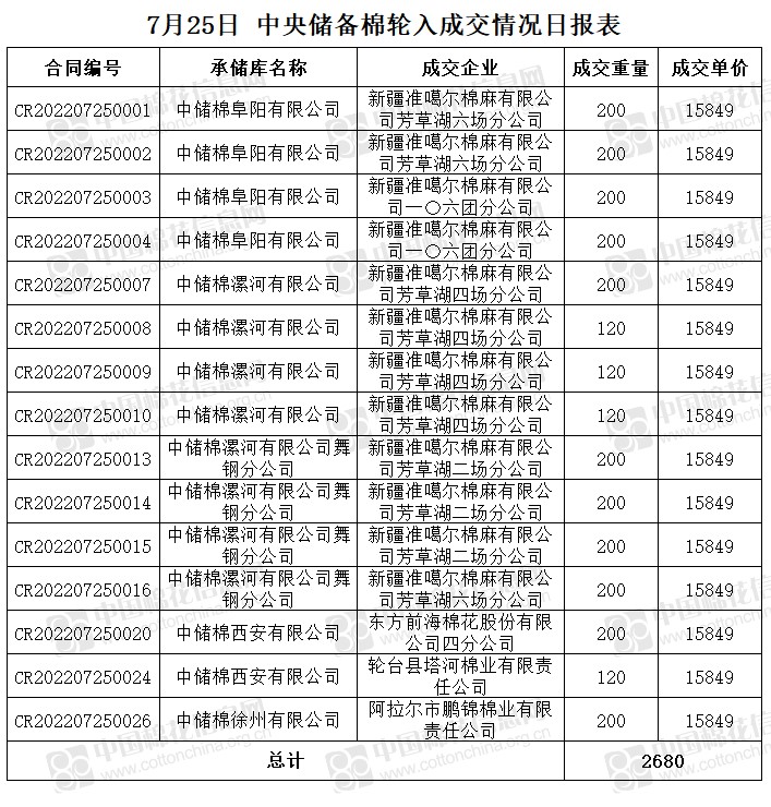 7月25日储备棉轮入成交率45% 成交均价上涨73元/吨 中国棉花信息网 07月25日 7月25日中央储备棉轮入上市数量6000吨,实际成交2680吨,成交率45%。今日平均成交价为15849元/吨,较前一日上涨73元/吨。 其中内地库成交2680吨,成交承储库5家。 今日成交情况如下:(文章来源:中国棉花信息网) (责任编辑:admin)