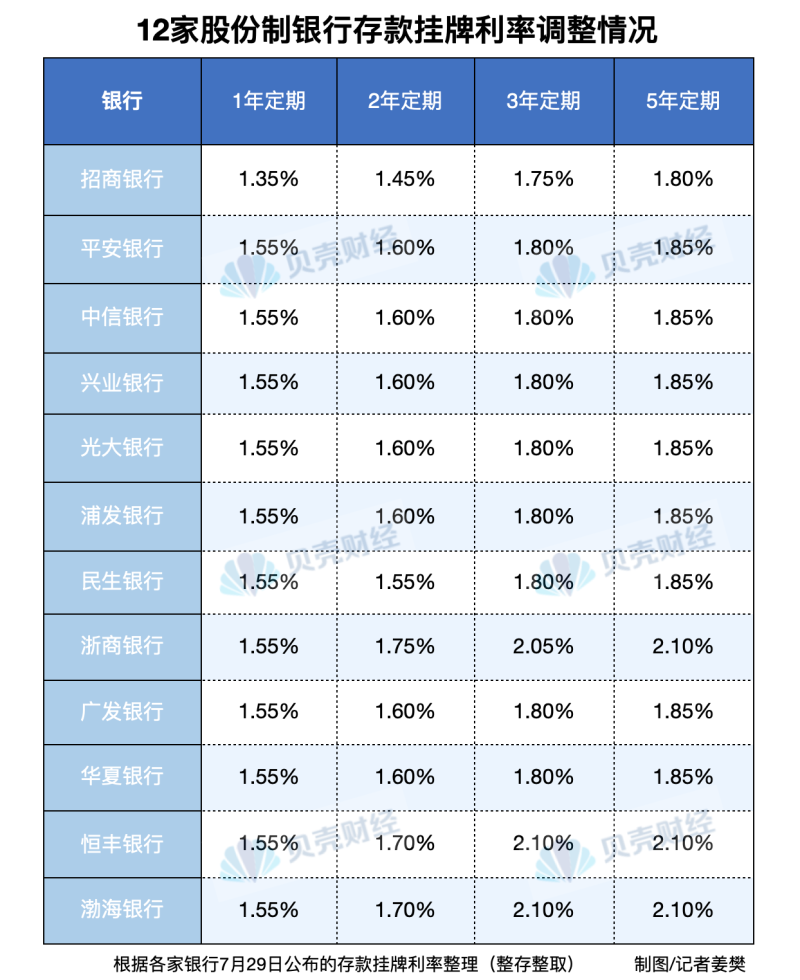 7月29日,又有10家股份制银行集体下调了存款利率,分别是中信银行、光大银行、兴业银行、浦发银行、浙商银行、广发银行、民生银行、恒丰银行、华夏银行和渤海银行。这是继上周六大国有银行,以及招商银行、平安银行之后,银行存款利率下行的持续传导。至此,12家股份制银行均已调降存款利率。 ![]() 贝壳财经记者发现,这10家银行的存款挂牌利率中,活期存款普遍降至0.15%。定期存款中,3年、5年整存整取利率普遍下调20个基点。其中,3年整存整取利率恒丰银行、渤海银行为2.10%,浙商银行为2.05%,其余银行普遍调降至1.80%。而5年整存整取利率中,浙商银行、恒丰银行、渤海银行的挂牌利率均为2.10%,其余银行普遍调降至1.85%。 (文章来源:新京报) (责任编辑:admin) |