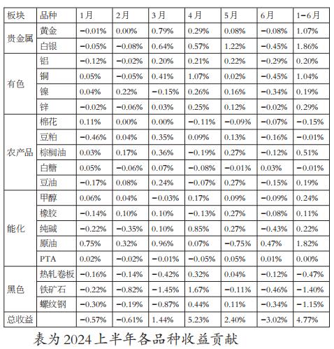 从以上结果可以发现两个现象:一是全量历史展期收益的平均贡献在年化2.45%,并且大多数年份的展期收益为正值;二是2024年上半年展期收益年化值仅1.25%,在历史上处于相对低位。同时,2024年各月份的展期收益贡献以正数为主,但正收益的幅度相对前些年大幅下降。 现象一的直接原因是多数品种多数时间处于反向结构,即现货价格高于近月期货价格,近月价格高于远月价格。主要源于产业交易者为了防范风险而在期货市场套保时让渡了部分收益。产业套保的头寸轧差后以空头为主,导致市场主动交易方的多空力量不平衡。因此,通过商品指数产品引入更多中长期的多头资金有利于平衡多空力量从而降低产业套保成本。 现象二表明2024年上半年商品市场多数品种以价差较小的反向结构为主,在二季度甚至转为平水为主。上半年商品市场主要在情绪和预期层面博弈,而非传统产业需求驱动。 [品种收益贡献]