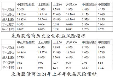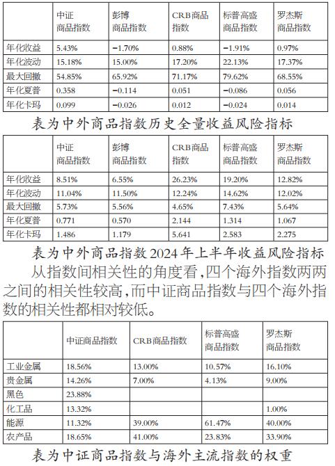 图为中外商品指数历史走势 此外,波动等风险指标和风险调整后的收益指标也值得关注。从风险指标维度看,不论是历史全量还是2024年上半年,中证商品指数在波动性和回撤控制上均显示出较强的稳定性。从风险调整后的收益指标维度看,中证商品指数在长期历史表现上较为突出,在2024年上半年稍显逊色。