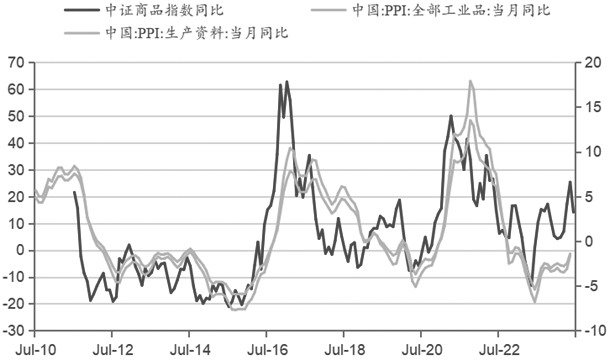 从2024年上半年的品种收益贡献看,正收益贡献较大的品种:白银(1.86%)、原油(1.82%)、黄金(1.07%)、铜(1.04%);负收益贡献较大的品种是铁矿石(-1.40%)、螺纹钢(-1.15%)。板块维度看,正收益贡献主要来自贵金属和有色,负收益贡献主要来自黑色,贵金属的强势主要是由于美元信用风险的抬升,而有色和黑色之间分化主要是由于国内经济转型的现实。 [宏观表征性] 作为以标尺性为原则之一的商品综合指数,中证商品指数的编制方案将商品的消费量纳入了权重计算逻辑。因此,中证商品指数理应和通胀等宏观指标具有较高的相关性和领先滞后关系。