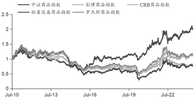 图为商品指数与其他大类资产的滚动相关系数 在进行投资组合的资产配置时,投资者更加关注的是风险调整后的收益。根据有效前沿理论,只有在组合中不断加入低相关资产,组合才能实现更高的风险调整后收益。从历史平均相关系数来看,商品和股票的相关系数仅有0.3左右,和债券的相关系数仅有-0.1左右,甚至低于股债的相关系数。因此,从相关性角度,商品指数对于提高组合的风险调整后收益也具有很高的价值。 从时序相关系数角度来看,股商和债商之间相关系数均具有一定的自相关性和均值回归的特征,同时二者长周期具有负相关关系,一定程度上来自股债间的跷跷板效应。因此,在传统股债组合中,加入商品指数对组合之间的风险对冲是有利的,同时在做实际配置时需要关注资产间相关系数的变化。 2024年上半年,债商之间的相关系数稳定在-0.05左右,而股商之间的相关系数由0.15左右缓慢提升至0.25左右,主要源于交易驱动的变化。自去年三季度开始,交易者的关注点在于人民币汇率变化和重点品种的供应影响,股商走出了相对独立的行情。今年以来,以上两点边际变化不再显著,宏观情绪和货币流动性重新成为交易重点,二者的一致性得到了加强。 [海外指数对比] 对比中证商品指数与海外主流商品指数,从历史全量看,中证商品指数相比海外主流指数走出了独立行情,从2024年上半年的情况来看,中证商品指数在区间收益上相较于海外主流指数略显逊色。