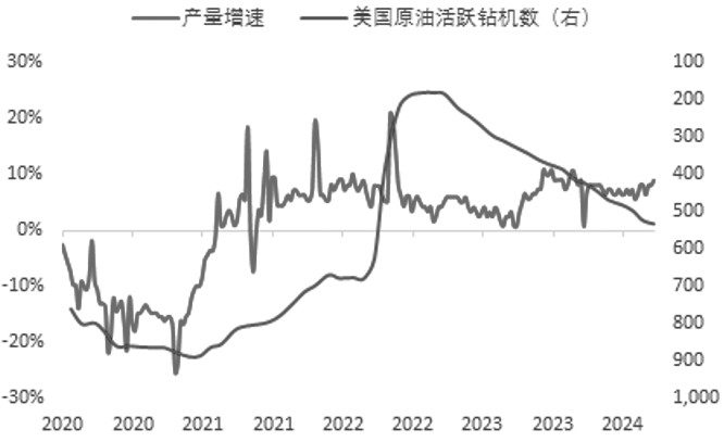 直接影响 在6月27日美国总统选举首场电视辩论前,拜登与特朗普民调支持率较为接近,但特朗普在重要的摇摆州中的支持率具有领先优势。然而6月底拜登在总统选举首场电视辩论中表现不佳,拜登和特朗普民调差距开始扩大,同时拜登面临民主党内部呼吁退出竞选的强大压力。 7月13日,特朗普在宾夕法尼亚竞选活动中遇袭后,凭借着临危不惧的政治表现吸引了更多选票,使其和拜登的民调差距扩大至3个百分点。 7月15—19日,万斯被提名和确定为共和党副总统候选人并发表演讲,阐述其政策主张。 7月21日,拜登宣布退选,并支持现任副总统哈里斯为民主党总统候选人,这一举动挽回了部分选民心意。在距离大选不到100天的时间里,候选人之间的竞争也越来越激烈,哈里斯能否保持优势凝聚民意还尚未可知。 特朗普政策中的相关内容与原油市场息息相关。与之前拜登政府倾向于发展清洁能源和削减碳排放,以推动2035年实现无碳化电力为目标的政策不同,特朗普政府倾向于支持美国能源独立,回归传统化石能源,包括加快发放石油和天然气的勘探许可,增产传统能源,并且取消新能源汽车补贴。由于加快石油和天然气的勘探许可发放或进一步使美国石油产量增加,特朗普政策主张下油价短期表现可能相对偏弱,但长期来看,取消新能源汽车补贴会导致相关产业链需求受损,反而利好原油需求。 从美国页岩油的产量来看,目前不包括墨西哥湾水域的本土48州的产量处于历史最高水平1330万桶/日。然而,未来产量的先行指标——美国原油活跃钻机数为2022年2月以来最低水平。钻机数下降的原因一方面是由于页岩油企业资本开支增速普遍放缓,另一方面是拜登政府因对绿色能源的重视,放缓对石油钻探许可的审批。