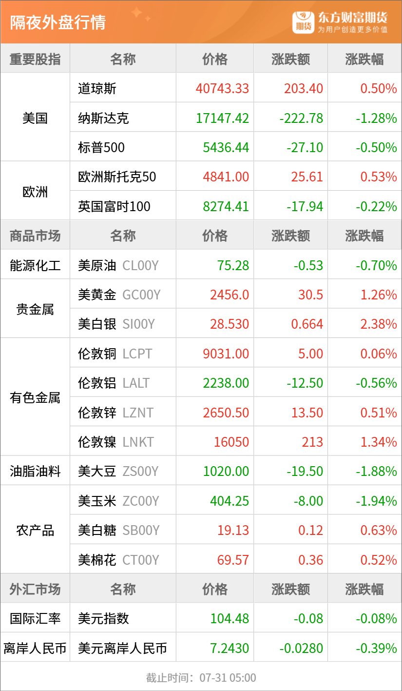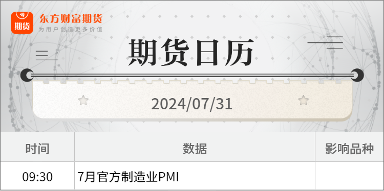 隔夜行情![]() ![]() 每日精选锂价跌至近8万元/吨!啥原因? 7月钢价继续承压下行 8月能否涅槃上涨? 利空突袭!万亿巨头传出大消息!最大铜矿或罢工 铜价会怎么走? 宏观产经新华社:中共中央政治局7月30日召开会议,分析研究当前经济形势,部署下半年经济工作,审议《整治形式主义为基层减负若干规定》。中共中央总书记习近平主持会议。 券商中国:美国财政部最新数据显示,美国联邦政府债务规模已突破35万亿美元。如果将这些巨额债务分摊到美国民众身上,相当于每人负债近10.4万美元。有美媒指出,今年,美国预计将出现历史上最大的赤字。 证监会网站:近日,国务院决定,任命李明为中国证券监督管理委员会副主席,免去方星海的中国证券监督管理委员会副主席职务。中央组织部通知,李明同志任中国证券监督管理委员会党委委员,免去方星海同志的中国证券监督管理委员会党委委员职务。 品种资讯黑色系期货 钢材:据不完全统计,7月30日约有14家钢厂调整建材出厂价格,螺纹钢价格最高下调50元/吨。(西本新干线) 7月30日,全国300家长、短流程代表钢厂废钢库存总量514.20万吨,较昨日降1.06万吨,降0.21%;库存周转天8.9天,较昨日持平。(Mysteel) 煤炭:电厂库存持续高位,加之上周台风后,清洁能源发电良好,煤炭市场博弈明显,船多货少,沿海煤炭运价小幅下跌。(上海航运交易所) 铁矿石:7月29日,中国47港进口铁矿石库存总量15666.28万吨,较上周一下降约27万吨;45港库存总量15078.28万吨,较上周一下降约50万吨。 7月22日-7月28日期间,澳大利亚、巴西七个主要港口铁矿石库存总量1262.1万吨,环比上升45.2万吨,库存绝对量略低于今年以来的平均值。(Mysteel) 农产品期货 生猪:截至7月30日14:00时,全国农产品批发市场猪肉平均价格为25.21元/公斤,比昨天下降0.6%。(农业农村部) 棕榈油:外媒援引印尼贸易部报道称,印尼8月毛棕榈油参考价格定为每吨820.11美元,高于7月的800.75美元。基于新的参考价格,毛棕榈油出口关税和专项税将分别为每吨33美元和每吨85美元。(新华财经) 棉花:7月29-30日青岛、张家港、南通等地保税巴西棉M 1-5/32(强力28/29GPT)净重报价78.85-80.35美分/磅,1%关税下直接进口成本约13820-14075元/吨;而7月30日河南、山东、江苏等内地仓储库3129B(断裂比强度28/29CN/TEX,主体等级31)公重报价15100-15300元/吨(卖方包三个月128元/吨汽运出库费,含仓单),考虑到净重、公重结算差异,当前1%关税下内外棉花价格顺挂幅度约1300-1700元/吨,较一周前缩窄200-300元/吨,进口棉竞争力有所下降。(中储棉信息中心) 有色/贵金属期货 碳酸锂:上海钢联发布数据显示,7月30日电池级碳酸锂价格较上次下跌2500元,均价报8.05万元/吨。(财联社) 沪金:7月30日,世界黄金协会发布的2024年二季度中国黄金市场回顾与趋势分析显示,今年二季度中国金饰需求趋弱的同时,投资需求表现强劲。(新华财经) 沪镍:海外镍企埃赫曼发布2024年第二季度生产报告,镍铁产量1.49万金属吨,同比下降15.34%,环比下降9.7%,镍矿630.2万湿吨。其中,位于新喀里多尼亚的SLN项目镍矿产量为38.9万湿吨;镍铁(FeNi)产量为0.83万金属吨。位于印度尼西亚的WedaBay镍项目的高品位镍矿产量为591.3万吨,镍铁(NPI)产量0.66万金属吨。(Mysteel) 能化期货 尿素:山东地区尿素行情基本稳定,小颗粒主流出厂成交2070-2140元/吨。临沂市场一手贸易商出货参考价格2130元/吨附近,菏泽市场参考价格2110-2120元/吨附近。(隆众资讯) 纸浆:山东地区针叶浆市场主流品牌报价在5650-6050元/吨,主流针叶浆价格较前一工作下降50元/吨。山东地区阔叶浆市场参考价在5000-5100元/吨,报盘较前一工作日下降50元/吨,实单商谈出货。(隆众资讯) 纯碱:湖北双环纯碱装置正常运行,纯碱暂不报价,设备预计8月底或9月初检修。(隆众资讯) 环球视野财联社:欧元区第二季度GDP同比增长0.6%,预期0.5%,前值0.40%。 财联社:英国利率期货显示,英国央行本周降息的概率为60%,而周一预期为58%。 每日关注![]() (文章来源:东方财富研究中心) (责任编辑:admin) |