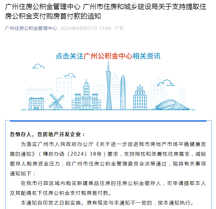 广州住房公积金管理中心广州市住房和城乡建设局关于支持提取住房公积金支付购房首付款的通知 各缴存人、各房地产开发企业: 为落实广州市人民政府办公厅《关于进一步促进我市房地产市场平稳健康发展的通知》(穗府办函〔2024〕38号)要求,支持刚性和改善性住房需求,减轻缴存人购房资金压力,经广州市住房公积金管理委员会决策通过,现将有关事项通知如下: 在我市行政区域内购买新建商品住房的住房公积金缴存人,可申请提取本人及其配偶名下住房公积金支付购房首付款。 本通知自印发之日起实施。原有规定与本通知不一致的,按本通知执行。 广州住房公积金管理中心 广州市住房和城乡建设局 2024年8月1日 ![]() (文章来源:广州住房公积金管理中心) (责任编辑:admin) |