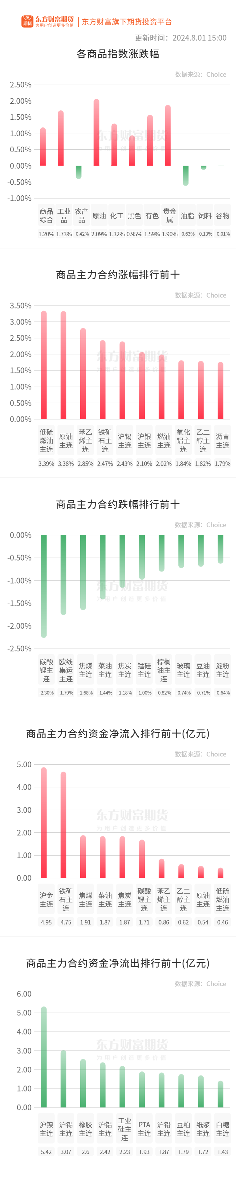 行情纵览![]() 宏观要闻界面新闻:2024年7月财新中国制造业采购经理指数(PMI)录得49.8,较6月下降2个百分点,2023年11月以来首次低于荣枯线,景气水平明显回落。 界面新闻:8月1日,国新办举行“推动高质量发展”系列主题新闻发布会。国家发展改革委副秘书长袁达表示,积极扩大内需。把促消费放在更加突出的位置,促进汽车、家电等大宗商品消费,推动教育、养老、育幼、家政等服务消费提质扩容,支持文体旅游高质量发展,不断优化人员往来便利措施,让外国朋友在中国旅行更方便、更舒适。促进有效投资,推进“十四五”规划102项重大工程建设,加快地方政府专项债券发行使用,实施好政府和社会资本合作新机制,进一步激发民间投资活力。统筹新型城镇化和乡村全面振兴,推动区域重大战略实施。 财联社:央行今日进行103.7亿元7天期逆回购操作,中标利率持平1.7%,与此前持平。因今日有2351亿元7天期逆回购到期,实现净回笼2247.3亿元。 品种资讯黑色系期货 钢材:截至8月1日当周,螺纹钢产量连续第五周下降,厂库由增转降,社库连续第四周减少,表需连续第三周减少。(Mysteel) 铁矿石:截至8月1日,原口径64家钢厂进口烧结粉总库存1133.53万吨,增13.28万吨;进口烧结粉总日耗60.31万吨,增0.01万吨;钢厂不含税平均铁水成本2681元/吨,降11元/吨。(Mysteel) 热卷:8月1日本网监测33个主要城市库存,本周热轧板卷社会库存340.5,周环比增加6.15,月环比增加9.47,年同比(公历)增加53.77。本网监测55个主要城市库存数据,本周热轧板卷社会库存482.34,周环比增加11.36,月环比增加28.02,年同比(公历)增加71.16。全国重点城市合计683.38。(单位:万吨)。(Mysteel) 农产品期货 生猪:截至8月1日14:00时,全国农产品批发市场猪肉平均价格为25.23元/公斤,比昨天上升0.3%。 7月22—28日,生猪定点屠宰企业生猪平均收购价格为19.49元/公斤,环比上涨1.6%,同比上涨22.5%;白条肉平均出厂价格为25.03元/公斤,环比上涨1.5%,同比上涨20.2%。(农业农村部) 大豆:巴西全国谷物出口商协会表示,巴西7月份大豆出口量估计为976万吨,比一周前估计的1043万吨调低了67万吨,但是仍高于去年同期的861万吨;玉米出口料为473万吨,较前一周预测的456万吨增加约20万吨。(新华财经) 油脂:7月26日,国内三大油脂库存总量206万吨,周环比上升4万吨,月环比上升26万吨,较去年同期的历史高位低6万吨。其中豆油库存110万吨,周环比上升2万吨,月环比及同比分别上升12万吨和14万吨;菜籽油库存43万吨,周环比上升1万吨,月环比回升2万吨,同比下降1万吨;棕榈油库存53万吨,周环比上升1万吨,月环比上升12万吨,同比下降19万吨,其中食用棕榈油库存47万吨。(国家粮油信息中心) 有色/贵金属期货 沪铜:截至8月1日,全国主流地区铜库存环比周一下降0.28万吨至34.84万吨,且较上周四下降0.91万吨,连续4周去库。(上海有色网) 碳酸锂:截至7月26日,港口和国内仓库锂矿石库存为9.6万吨,环比上升0.2万吨。海外锂矿石持续到港中,实际成交不及预期,港口现货库存充足。(Mysteel) 能化期货 玻璃:截止到8月1日,全国浮法玻璃样本企业总库存6909万重箱,环比增加199.9万重箱或2.98%,同比增加51.13%,折库存天数29.5天,较上期增加0.9天。(隆众资讯) 尿素:山东地区尿素行情小幅上涨,小颗粒主流出厂成交2080-2170元/吨。临沂市场一手贸易商出货参考价格2160-2170元/吨附近,菏泽市场参考价格2130-2140元/吨附近。(隆众资讯) 烧碱:截至8月1日,全国20万吨及以上液碱样本企业厂库库存39.60万吨(湿吨)环比上涨1.12%,同比上涨11.97%。(隆众资讯) 纯碱:截至8月1日,本周纯碱综合产能利用率90.63%,上周89.01%,环比上涨1.62个百分点。周内纯碱产量75.56万吨,环比增加1.35万吨,涨幅1.82%。轻质碱产量30.64万吨,环比减少0.41万吨。重质碱产量44.92万吨,环比增加1.76万吨。本周国内纯碱厂家总库存107.48万吨,环比上周增加8.89万吨(+9.02%),较周一增加6.05万吨,涨幅5.96%。其中,轻质库存57.59万吨,重质库存49.89万吨,当前纯碱厂家库存处于同期历史高位水平,同比增349.33%。 截至8月1日,中国氨碱法纯碱理论利润240.50元/吨,环比下跌94.61元/吨。周内成本端焦炭价格窄幅下移,而纯碱价格亦是下调,因此利润下跌明显。本周联碱法纯碱理论利润(双吨)为446.6元/吨,环比下跌70元/吨。主要成本端煤炭价格无明显波动,而纯碱价格继续下行,导致利润收缩。(隆众资讯) 乙二醇:截至8月1日,华东主港地区MEG港口库存总量61.63万吨,较上一统计周期增加5.03万吨。(隆众资讯) 晚间关注无 (文章来源:东方财富研究中心) (责任编辑:admin) |