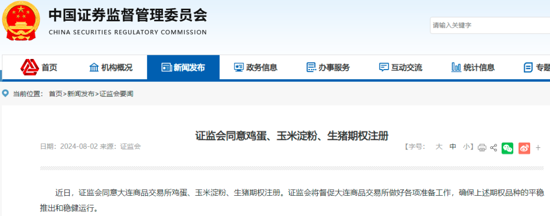 8月2日,证监会发布消息,同意鸡蛋、玉米淀粉和生猪期权注册。另外,来自中国期货市场监控中心的消息显示,截至2024年6月末,全市场有效客户总数233万个,创历史新高;期货公司客户权益集中度进一步提升。 证监会同意鸡蛋、玉米淀粉和生猪期权注册 8月2日,中国证监会发布通知,同意大商所鸡蛋、玉米淀粉和生猪期权注册。这意味着,大商所期权品种将增至16个,服务实体经济、服务“三农”的衍生工具将进一步丰富。 ![]() 据期货日报记者了解,鸡蛋作为优质的蛋白质来源,是我国主要的禽蛋品种和百姓餐桌上极为常见的营养食品。玉米淀粉作为我国产量最大的淀粉品种,位居玉米产业链重要环节,是淀粉糖、造纸、食品、啤酒、医药等行业的重要原料,下游应用领域广泛。生猪是我国居民的主要肉食来源,产业规模达万亿元,涉及千家万户、千厂万企,是关乎国计民生的重要农副产品。近年来,鸡蛋、玉米淀粉和生猪现货价格波动明显,产业企业对运用衍生品开展风险管理的需求强烈。 为更好地服务产业避险,2013年起,大商所先后上市了鸡蛋、玉米淀粉和生猪期货。上市以来,三个期货品种功能有效发挥,市场影响力稳步提升,越来越多的产业链企业利用期货工具开展风险管理,基于生猪、鸡蛋等品种的“保险+期货”模式在助力乡村振兴方面发挥了积极作用。 记者了解到,鸡蛋、玉米淀粉和生猪三个期权上市后,将与相对应的期货品种和豆粕、玉米等期货及期权工具一起,为相关产业提供同时覆盖原料和产品、期货和期权的更为完整健全的衍生工具链条,通过发挥期货、期权工具合力,为产业链企业提供更加完备的风险管理工具和更加精细灵活的避险策略,优化现货贸易模式,满足产业精细化风险管理需求。同时,上市期权工具也将进一步提升标的期货市场的运行质效,提高期货市场价格发现效率,促进期货市场功能充分发挥。 在吉林金翼蛋品有限公司经理宫志强看来,期权类似于保险,有风险收益非线性的特点,特别是对买入期权来说,在支付权利金后,不需要追加保证金。从资金成本的角度,企业可以用较小的资金满足自身套保的需求,非常适合蛋鸡养殖企业。从定价机制的角度,期权有不同的到期日,也有不同的行权价,企业可以更好地根据自身的实际情况,来确定未来拟锁定的买卖价格,并通过灵活运用多种策略,来实现精细化的套期保值。 中粮生物科技股份有限公司运营管理部副总经理朱勇生表示,玉米淀粉期权上市后,产业链企业可以针对自身经营的淀粉敞口风险,在传统期货套保的基础上,形成“期货+期权”组合拳,进行“动态套保”。一方面,帮助上游淀粉加工企业锁定产品利润;另一方面,帮助下游淀粉消费企业锁定原料采购成本。 牧原食品股份有限公司董事会秘书、首席战略官秦军认为,利用期权进行风险对冲可以在事前预知对冲成本,更易于企业进行财务管理和风险防控。生猪期权上市后,生猪产业链企业将由原来的单一利用生猪期货套期保值转为综合运用多种工具进行风险管理。“生猪期权的上市将丰富企业的避险工具箱,助力企业构建新型风险管理模式,更为有效地降低经营风险和销售风险。”秦军表示。 据了解,近年来我国期货和期权市场稳健发展、平稳运行,为鸡蛋、玉米淀粉和生猪期权上市奠定了坚实基础。2024年上半年,鸡蛋、玉米淀粉和生猪期货日均成交量分别为31万手、15万手和8万手,日均持仓量分别为40万手、24万手和17万手,套期保值效率保持在90%左右。目前,大商所已上市13个期权品种,随着鸡蛋、玉米淀粉和生猪期权上市,大商所农产品板块期权工具将进一步丰富。 大商所相关负责人表示,下一步,大商所将与市场各方共同做好上市前各项准备工作,确保新期权工具平稳上市运行,同时强化市场培育,为企业用好期权工具提供助力,更好服务农业高质量发展。 国内期货市场有效客户总数233万个,创历史新高 根据中国期货市场监控中心8月2日发布的消息,2024年以来,期货开户业务保持平稳增长,期货客户总量、增量和质量稳步提升。 客户规模不断扩大。2024年上半年,期货市场新开客户数40万个,与去年同期相比增加16%。截至2024年6月末,全市场有效客户总数233万个,创历史新高。境外客户总数相比五年前增长近5倍。 交易者结构持续改善。截至2024年6月末,全市场机构交易者的客户数、成交量及持仓量较2019年同期分别增加139%、188%和358%,个人交易者上述三项的增长率分别为65%、68%和197%,机构交易者的增速明显高于个人交易者。 期货公司客户权益集中度进一步提升 中国期货市场监控中心当日发布的另一则消息显示,近年来,期货公司持续聚焦主业,经纪业务快速发展,客户权益规模显著增长,从2019年底的0.5万亿元增长至2024年6月底的约1.4万亿元。与此同时,期货公司客户权益集中度进一步提升。截至2024年6月底,客户权益排名前10、20、30位的期货公司客户权益合计占全行业期货公司客户权益总量的比例分别为45.1%、61.5%、71.4%,与2019年底相比(该数据分别为40.5%、56.6%、66.7%)显著提升。 2024年4月,国务院发布《关于加强监管防范风险推动资本市场高质量发展的若干意见》,提出稳慎有序发展期货和衍生品市场。对于机构监管,提出支持头部机构提升核心竞争力,鼓励中小机构差异化发展、特色化经营,为机构发展指明了方向。从数据看,期货行