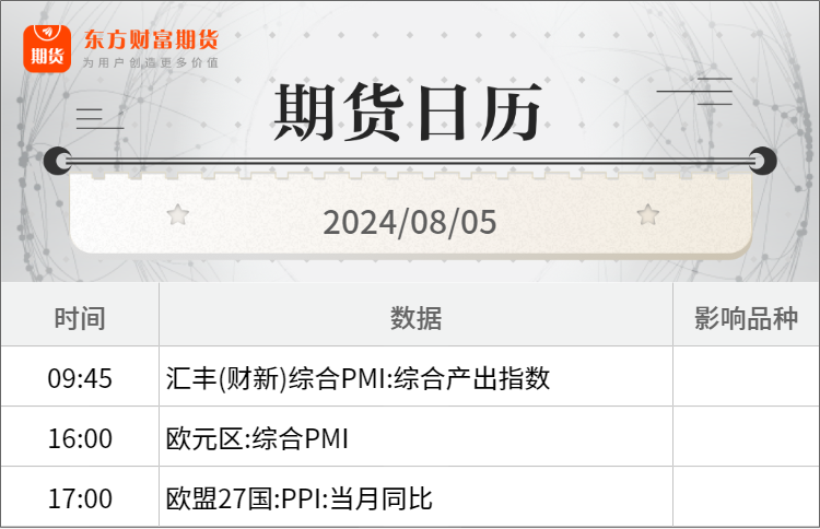 东方财富期货早餐 8月5日 周一
