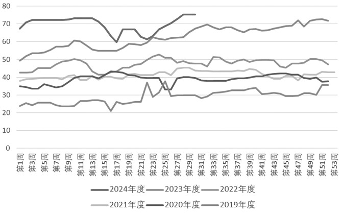 图为PX社会库存走势(单位:万吨) [聚酯产品出口表现亮眼] 2024年新增PTA产能450万吨,已于上半年完成投放,产能增速5.6%,年产能达到8511.5万吨。虽然本年度新增产能不多,但2023年投产的新产能较多,且产能兑现为产量。根据相关数据,1—6月国内PTA产量共计3421.23万吨,同比增长17.58%,且2025年仍有千万吨的新产能投产,PTA供应过剩压力将进一步加大。