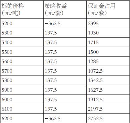 图为卖出看涨期权损益 卖出宽跨式期权策略 考虑到成本支撑以及聚酯需求尚可,预计PTA后市下跌幅度有限。可根据过往行情及预判,选择预期的支撑位卖出看跌期权。考虑到近期PTA处于下行周期,价格仍有进一步走低可能,为更稳妥,可等待价格进一步回调后,再在下方判断的支撑位卖出看跌期权,与之前已卖出的看涨期权构成卖出宽跨式组合。该组合基于对行情维持震荡走势预期,随着时间的流逝,如果PTA没有超出预判的波动区间,就可以获得时间价值收益,最大收益为全部的权利金收入。到期前,若标的市场价格超预期大幅上涨或下跌,卖方承担任何一个方向的潜在风险。 例如7月29日PTA410价格为5766元/吨,卖出PTA410C6100合约,考虑此段下跌行情已基本完成,在预期较安全的支撑位再卖出PTA410P5300合约,构成卖出宽跨式组合。卖出期权需要支付保证金,需关注价格波动时的追加保证金风险。卖出宽跨式组合适用郑商所的组合保证金优惠,对组合到期的资金占用(使用交易所保证金标准)及收益进行估算如下: