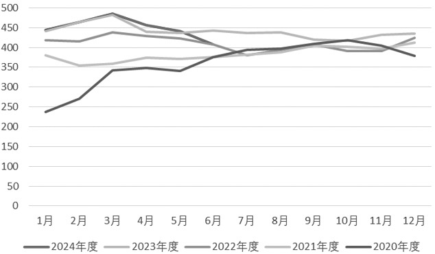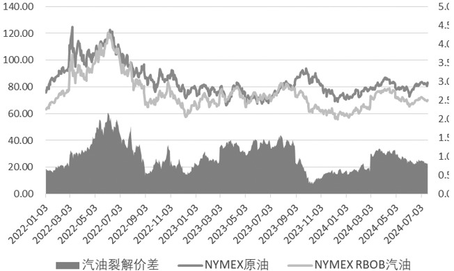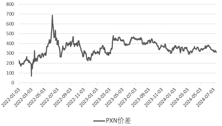 图为PXN价差走势(单位:美元/吨) 调油需求不及预期,对PX的影响减弱。根据2022年、2023年的需求规律,调油需求是推动亚洲PX价格上涨和其他芳烃需求的关键因素。而经过两年调整,亚洲往北美运输芳烃的贸易格局已逐渐调整完成,且在北美汽油供给恢复、高利率对汽油需求有一定压制的情况下,汽油供需矛盾减少,故汽油调和利润不及市场预期,亚美价差及芳烃调油窗口关闭,调油逻辑对PX的影响减弱,PX价格走势更依赖于其自身供需。