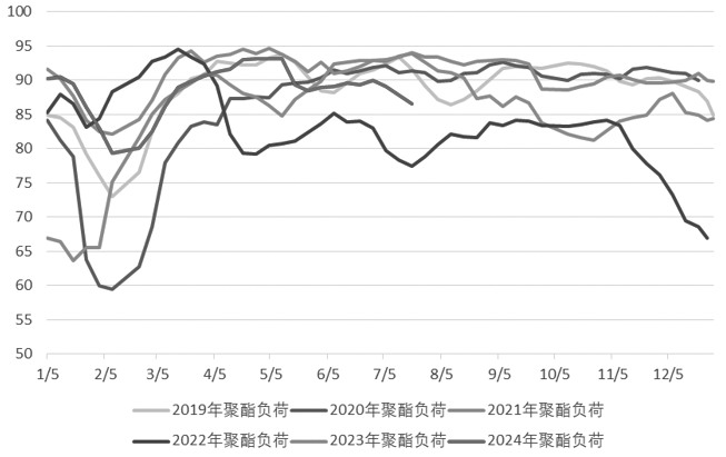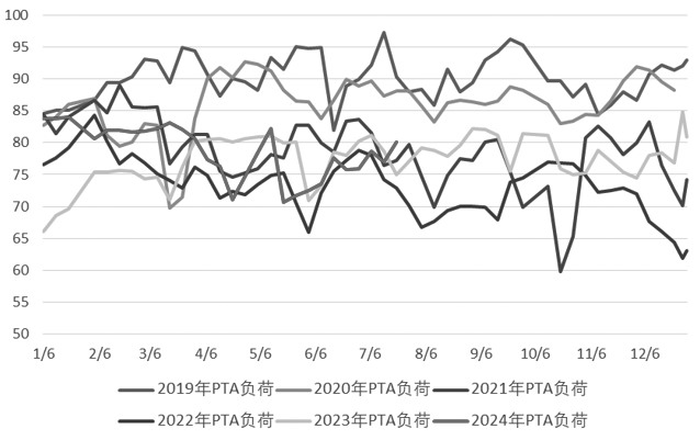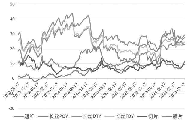 图为PTA基差走势(单位:元/吨) 一季度PTA开工负荷较高,出现较大幅度累库。二季度在装置集中检修及聚酯负荷提升情况下,库存去化速度较快。从供需平衡表角度来看,4月、5月均有15万吨以上库存去化。6月以来,PTA装置检修重启,但负荷回升不及预期,预计短期内库存持续去化。 2022年以来,随着产能扩张及PTA内盘价格优势凸显,带动出口进一步增加。2024年1—5月PTA累计出口181万吨,同比增长7.4%,占同期国内产量的6.4%。虽然受BIS政策影响,我国对印度出口减少,但其对土耳其、越南、埃及和阿曼的出口大幅增加,基本上抵消了对印度的出口损失。 由于我国的成本和价格优势,长丝、短纤、瓶片等聚酯产品出口数量维持高位。2024年1—5月短纤累计出口51.23万吨,占同期产量的17%;长丝累计出口159.13万吨,占同期产量的11%;瓶片累计出口221.83万吨,占同期产量的36%。但海运费上涨对出口仍有一定抑制。 [关注计划外检修情况] 2024年上半年,聚酯新增投产335万吨,其中瓶片投产较多。聚酯上半年累计产量3530万吨,同比增长17.92%。产量快速增长主要是因为新增产能投放,且整体负荷较去年同期偏高,对PTA存在需求支撑。近期,聚酯负荷有边际下降趋势,主要是由于瓶片负荷下降及长丝的主动减产挺价。 聚酯产品库存水平整体偏高,特别是长丝库存由于前期开工率较高及需求转弱,处于历史较高水平。聚酯现金流今年有所回落,目前短纤现金流较好;瓶片由于去年以来投入过多呈亏损状态。