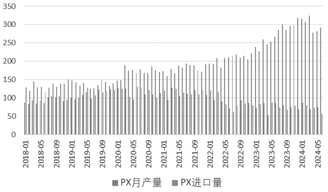 [PX产量高速增长] 虽然目前PX没有新产能投产计划,但由于去年新增产能较多,加上开工率提升,实际产量仍大幅增长。2024年1—6月,PX国内产量合计1797.68万吨,同比增长20.56%。回顾一季度,开工率较高,产量持续攀升,累库压力下,PXN加工差压缩;二季度,随着传统检修季的到来,开工率和产量明显回落,PXN加工费也有所恢复,但仍低于去年水平。后期随着检修装置的逐步回归,预计PX供应将持续增加。