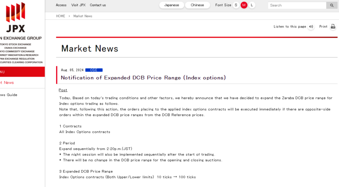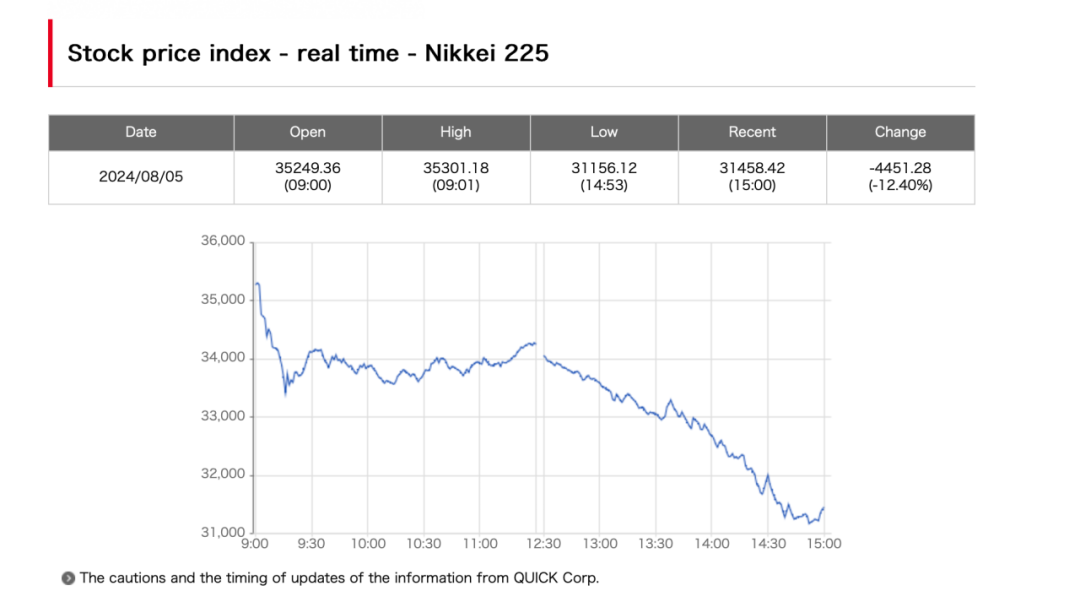 全球金融市场“黑色星期一”。 周一,日本股市经历近些年的最大跌幅,跌幅之大甚至扰动全球股票市场,全球多个股票市场均出现近年罕见的跌幅。 多次熔断,亚太市场全线暴跌 日本股市和追踪日本股市的指数期货今天遭遇了近些年最为惨烈的下跌,日经225指数期货和东证指数期货盘中均多次触发熔断机制,一度暂停交易。 具体来看,日经225指数盘中暴跌逾13%,收盘暴跌4451.28点,跌幅12.4%,报31458.42点,创下了最近34年来最大单日跌幅。 ![]() 日本东证指数也大跌超12%。 ![]() 另外,日本证券交易所集团今天罕见地发布公告表示,基于今天的交易条件和其他因素,特此宣布,决定扩大Zaraba DCB指数期权交易的价格范围。 ![]() 日本股市近些年来总体表现较好,上一次日经225指数收盘跌幅超过8%的情形还要追溯到2011年3月15日,当天日经225指数收盘暴跌10.55%,彼时正值日本福岛核事故发生后不久,市场骤然弥漫恐慌情绪,股市随之经历一轮狂跌,2011年3月14日,日经225指数暴跌6.18%,此后一个交易日进一步暴跌10.55%。 再往前推,日本股市跌幅超过8%的交易日则要追溯到2008年的全球金融海啸期间,当时也出现过几次日经225指数跌幅超过8%的情形。 除了股市狂跌以外,日经225指数波动率也大幅飙升,截至目前大涨140%,创史上最大单日涨幅。 ![]() 在日本股市下跌之际,亚太区其他市场也惨烈下跌。韩国综合指数盘中跌幅超过10%,盘中触发熔断。韩国KOSDAQ指数盘中跌幅则超过13%,盘中同样触发熔断。 新加坡海峡指数盘中跌幅一度在5%左右。 中国台湾地区股市也大跌,台湾加权指数跌幅超过8%。 受外围股市拖累,上午表现一度强势的A股、港股市场午后也走低。截至收盘,沪指、深证成指、创业板指均跌超1%。 ![]() 多只跨境ETF和LOF午后显著扩大跌幅。日经225ETF(513880)、标普信息科技LOF(161128)、纳指科技ETF(159509)午后盘中封住跌停。 港股方面,恒生指数、恒生科技指数目前跌幅均超过2%。 恐慌指数飙升,加密货币重挫 尽管美股还未开盘,但美股几大指数期货在今日午后均扩大跌幅,截至发稿,道指期货跌超1%,标普500指数期货跌2.79%,纳斯达克100指数期货跌超5%。 ![]() 此外,有“恐慌指数”之称的标普500VIX指数期货大幅飙升,一度涨超66%。 ![]() 欧股方面,目前主要指数期货均跌超2%。 ![]() 此外,加密货币市场也重挫,比特币一度跌破49000美元关口。数据显示,加密市场总市值一度跌破1.9万亿美元,近24小时,全市场共有超27万人爆仓,爆仓总金额超10亿美元。 市场缘何大跌? 对于近两个交易日全球金融市场的巨震,市场分析人士认为,或与以下因素有关: 1.美国非农数据不及预期,引发市场对美国经济“硬着陆”担忧。当地时间8月2日,美国劳工统计局发布数据显示,7月非农就业人数新增11.4万人,前值20.6万人;失业率反弹至4.3%,前值4.1%。 2.巴菲特大幅砍仓苹果。周末的消息显示,巴菲特旗下伯克希尔·哈撒韦公司二季度将其持有的苹果股份从一季度的7.89亿股大幅削减至约4亿股,持股市值约为842亿美元,较一季度末的1743亿美元大幅缩水。此外,近期巴菲特还大量抛售其“二号持仓”美国银行。伯克希尔·哈撒韦公布的最新文件显示,公司连续12天抛售美国银行的股票。在7月30日至8月1日期间,伯克希尔·哈撒韦通过出售1922万股美国银行股票,套现7.79亿美元。 3.地缘政治风险。中东地区的紧张局势,特别是伊朗和以色列之间的潜在冲突,增加了全球市场的不确定性,对金融市场造成了压力 。 (文章来源:证券时报) (责任编辑:admin) |