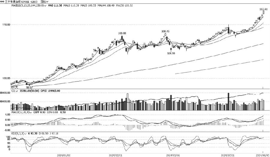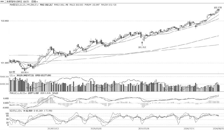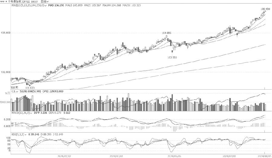 TS加权震荡上行走势未变,近期创新高后量仓等指标略有分化。周一早盘小幅高开后震荡回落,盘中翻红后持稳,以小阴线报收。TS主连合约大幅减仓,远月合约不同程度加仓。TS加权MACD指标红柱小幅收窄,KDJ快线高位有钝化之嫌,且有下行迹象。总体看,上行动能略显不足且量仓支持度减弱,短期高位震荡为主,建议多单谨慎持有。 T 多单持有