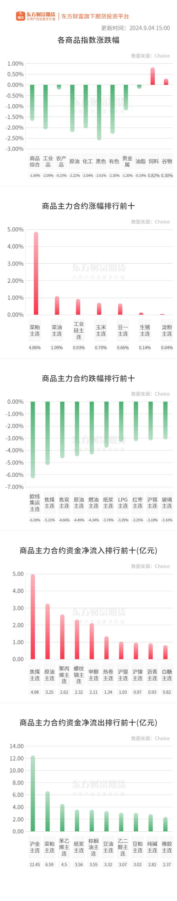 行情纵览![]() 宏观产经财联社:今日公布的8月财新中国通用服务业经营活动指数(服务业PMI)录得51.6,较7月下降0.5个百分点,为年内次低,显示服务业继续扩张但速度放缓。 每日经济新闻:虽然8月是楼市传统淡季,但全国100个城市新房成交均价却同比、环比双双上涨。具体来看,据中指研究院数据,8月份百城新建住宅平均价格为16461元/平方米,同比涨幅达1.76%,环比上涨0.11%。 品种资讯黑色系期货 锰硅:近日,内蒙古乌兰察布地区丰镇某合金厂检修一台硅锰合金矿热炉,影响日产180吨左右,复产时间暂未确定。(Mysteel) 钢材:截至9月4日当周,找钢网库存分析:建材产量280.31万吨,周环比增22.04万吨,升8.53%;年同比减49.80万吨,降15.09%。(找钢网) 中钢协发布2024年8月下旬钢材社会库存监测旬报,截至8月下旬,21个城市5大品种钢材社会库存936万吨,环比减少79万吨,下降7.8%,库存降幅扩大;比7月下旬减少104万吨,下降10.0%;比年初增加207万吨,上升28.4%;比上年同期减少26万吨,下降2.7%。(新华财经) 农产品期货 据彭博调查,分析师平均预计2024年8月马来西亚棕榈油库存为186万吨,较7月增加7.5%,攀升至自2月以来的最高水平;产量为190万吨,较7月增加3.3%,为去年10月以来的最高水平;出口量为150万吨,较7月下降了约11%。(新华财经) 豆油:美国农业部(USDA)周二发布的油籽压榨报告显示,美国7月大豆压榨量为580.3654万吨(1.934亿蒲式耳),高于6月的551.046万短吨(1.84亿蒲式耳)和2023年7月的555万吨(1.85亿蒲式耳)。美国7月豆油产量为23.05亿磅,高于市场预期的19.68亿磅。美国7月玉米干酒糟(DDGS)产量为199.95万吨,高于之前一年同期的178.4万吨。(新华财经) 玉米:据Mysteel农产品调查数据显示,本周(8月29日-9月4日)全国玉米加工总量为59.04万吨,较上周减少2.75万吨;周度全国玉米淀粉产量为28.11万吨,较上周产量减少1.88万吨;周度开机率为54.34%,较上周降低3.63%。(Mysteel) 菜油:船期监测显示,9-12月船期我国加拿大油菜籽买船数分别为10船、8船、7船和3船,四季度进口油菜籽理论到港量较大,9-11月月均到港在50万吨左右。随着我国对自加拿大进口油菜籽发起反倾销调查,市场担忧未来我国进口油菜籽实际到港低于前期预期。(国家粮油信息中心) 生猪:国家统计局数据显示,据对全国流通领域9大类50种重要生产资料市场价格的监测显示,2024年8月下旬与8月中旬相比,20种产品价格上涨,26种下降,4种持平。其中,生猪(外三元)价格为19.7元/千克,环比下降5.7%。 有色/贵金属期货 黄金:近期披露的黄金ETF半年报显示,部分外资机构选择在上半年抛售,如桥水基金、巴克莱银行等。同时,也有不少新机构现身于黄金ETF的前十大持有人行列。有业内人士指出,短期来看,要警惕黄金市场内套利资金离场所造成的波动。此外,如果美联储政策预期并不激进,黄金市场短期将面临利多出尽的回调风险。中长期来看,随着美联储降息周期的开启,金价仍有上涨空间。(中国证券报) 碳酸锂:当地时间9月4日,澳矿商Liontown Resources宣布,Kathleen Valley自上月宣布首次生产起已产出超过10000吨平均品位约为5.2%的锂辉石精矿,生产进度符合公司预期。公司物流链已经全面投入使用,现场和港口部分也已全面运营,为集中运输好做准备。公司按计划将于9月底开始装运。(SMM) 9月4日,上海钢联发布数据显示,今日电池级碳酸锂价格较上日下跌500元,均价报7.45万元/吨。(每日经济新闻) 能化期货 甲醇:截至2024年9月4日,中国甲醇港口库存总量在117.44万吨,较上一期数据增加5.01万吨。其中,华东地区累库,库存增加1.85万吨;华南地区累库,库存增加3.16万吨。(隆众资讯) 原油:Yulia Grigsby等高盛分析师在一份报告中指出,油价最近的下跌“相对于基本面消息而言幅度偏大”,为金融需求复苏留下了空间,尽管价格有进一步下跌的风险。他们表示,油价下跌是因为利比亚原油供应有望恢复,以及投资者在美国发布的经济数据不佳后规避风险,跌势可能因追踪趋势的算法交易策略被放大。高盛预计非OPEC产油国的供应增长将更为强劲,尤其是加拿大。综合来看,该行对布伦特油价70-85美元/桶的预测区间面临的风险偏向下行。(财联社) 尿素:9月4日尿素行情继续下行,部分主流地区报价下调10-30元/吨左右。(农时达情报) 晚间关注无 (文章来源:东方财富研究中心) (责任编辑:admin) |