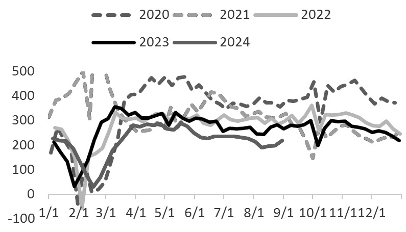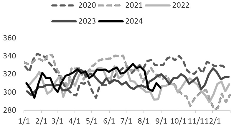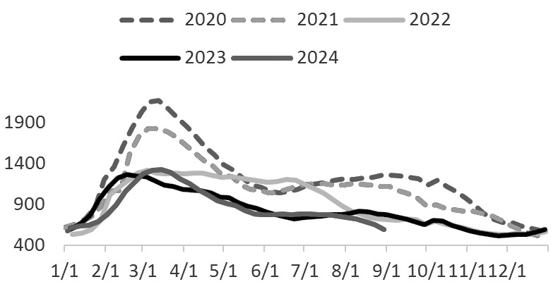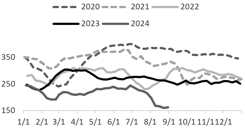 图为螺纹钢总库存(单位:万吨) 值得注意的是,原料端对钢价的成本支撑偏弱。当前钢厂利润一般,铁水日产回落,原料需求进一步下滑。但铁矿石供给增幅明显,焦煤主产区产量仍在回升。原料供应过剩,虽然节前有补库需求,但若钢材需求不及预期,仍有负反馈可能。 整体看,“金九银十”来临,需求仍是决定钢价走势的核心因素。虽然当前专项债发行提速,但实际效果尚未显现。此外,近月合约仓单注册量逐步增加,若旺季需求未达到预期,钢材价格可能仍将面临下跌风险。(作者期货投资咨询从业证书编号Z0014488) (责任编辑:admin) |