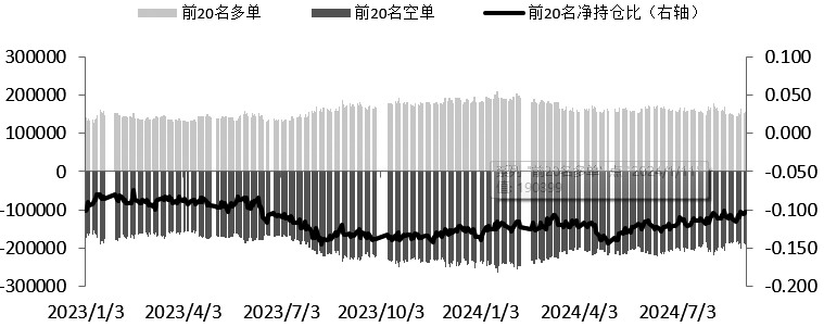 受外围市场影响,9月4日,A股震荡下行,上证指数最低探至2781点,创近7个月来的新低,当日收报于2784.28点。同时,期指品种全线回落。截至收盘,IF、IH、IC及IM主力合约分别下跌0.59%、0.87%、0.17%及0.24%。基差方面,仅IH主力合约贴水幅度较上一交易日略微扩大至2.4点,IF、IC及IM主力合约贴水幅度分别收窄至2.2、12.9及14.6点。 期指总体持仓量回落,四个品种共计减仓8733手,总持仓量降至843731手。各品种持仓变化并不一致。其中,IF减仓1316手,持仓量降至229224手;IH增仓97手,持仓量升至96485手;IC减仓1657手,持仓量降至241035手;IM减仓5857手,持仓量降至276987手。 各品种前20(主力)席位的持仓量均较前一交易日有所回落。具体来看,IF多头主力减仓2108手,空头主力减仓3401手,净空持仓量降至35045手;IH多头主力减仓577手,空头主力减仓1012手,净空持仓量降至16462手;IC多头主力减仓1322手,空头主力减仓1172手,净多持仓量降至2510手;IM多头主力减仓4683手,空头主力减仓4330手,净空持仓量升至19878手。