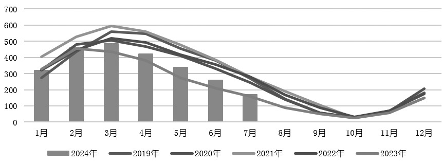 图为中国糖工业库存(单位:万吨) 8月上半月,巴西生产数据稍低于预期,中南部甘蔗压榨量为4383万吨,同比下降8.57%;糖产量为310.9万吨,同比减少10.24%;累计入榨甘蔗37744万吨,同比增长4.83%;累计产糖2391万吨,同比增长5.41%。 巴西从7月下旬开始步入传统的蔗糖榨季供应高峰期,供应持续上量,连续超300万吨的双周产量带来市场压力,原糖期货盘面更多在消化现货市场的强现实。8月末,巴西突发大范围火灾,受大火影响的甘蔗的种植面积目前仍在评估中,据统计在100万~200万亩。火灾发生后,甘蔗仍可以被压榨,但糖分损失在20%~40%。对2024/2025榨季来说,被烧过的甘蔗需要重新翻种,影响甘蔗质量。巴西蔗糖行业协会(UNICA)已经在评估火灾的影响,天气风险对甘蔗减产的影响需等待后续的数据来测算,前期甘蔗质量不佳和单产下调使得巴西2024/2025榨季存在提前收榨的预期,支撑原糖价格。 [2] [印度首次预估为新榨季留出安全库存] 7月30日,印度糖厂与生物能源制造商协会(ISMA)首次公布了其对2024/2025榨季印度糖产量的预估,预计总糖产量为3331万吨,但其没有进一步预估乙醇分流和净糖产量。在此之前,市场对印度新榨季糖产量预估存在较大分歧,认为2024/2025榨季全球糖贸易流大幅过剩的机构将印度总糖产量预估给到3600万~3700万吨的高值。从历史数据来看,印度首次估产与实际糖产量之间通常存在差异,因此仍需重视后续的边际变化。 相对确定的是,2023/2024榨季印度通过减少乙醇分流和限制出口的政策,使印度糖市期末库存回到800万~900万吨的区间,为新榨季乙醇和出口政策的灵活调整提供了更多可能性。 在乙醇分流政策上,2023/2024榨季原定要实现15%的乙醇混合目标,榨季前期的减产预期使印度政府将初期的450万吨乙醇分流量调整至203万吨。新榨季印度政府为实现G20计划,在优先级上有更大概率将制乙醇放在出口之前。在印度新榨季开榨也就是产量明晰之前,印度出口量会维持现有限制额。因此,北半球增产未出现预期差,原糖期货盘面短期内基本消化巴西火灾的影响,关注原糖期货19美分/磅的支撑。 [3] [国内压力来自新榨季增产及进口上量] 从国内市场来看,销售方面,截至7月底,全国累计销售食糖825.14万吨,同比增加86.68万吨,增幅达到11.74%。7月单月销糖87万吨,同比增加36万吨;累计销糖率为82.82%,同比加快0.53个百分点。库存方面,截至7月底,食糖工业库存为171.18万吨,同比增加12.27万吨。 统计数据显示,截至8月20日,广西糖第三方库存量为45万吨,较去年同期减少25万吨,去库效率比往年偏快。从2023年糖价高企开始,终端备库量缩减,随用随采的特征并未松动。7月中秋节食糖备货上量,终端采购小幅加速,但是市场期待的大幅放量并不明显。盘面未反映销售利好,2409合约在8月20日承压下跌18元/吨,收在6125元/吨,前期支撑反弹的因素出现松动。 8月开始,中秋节备货接近尾声,同时加工糖正式到港进入市场,各糖业集团价格下调加速,截至9月3日,广西制糖集团下调20~40元/吨,主流报价区间在6190~6360元/吨;加工糖厂下调10~50元/吨,主流报价区间为6330~6410元/吨。现货市场孱弱,降价才能放量的格局无法支持价格大幅反弹。 国内糖市远期的压力主要来自新榨季增产以及进口糖上量。从国产糖生产来看,甜菜糖是最早上市的新糖,并已经开始预售。因为新榨季产能提升,甜菜糖产区将提前开榨,最早的甜菜新糖将在9月底或者国庆节假期供应。进入交割月的2409合约将对陈糖交割,期货贴水现货也体现了对陈糖品质的贴水。期货市场上2409合约回归现货购销逻辑,对标甜菜糖销售。
