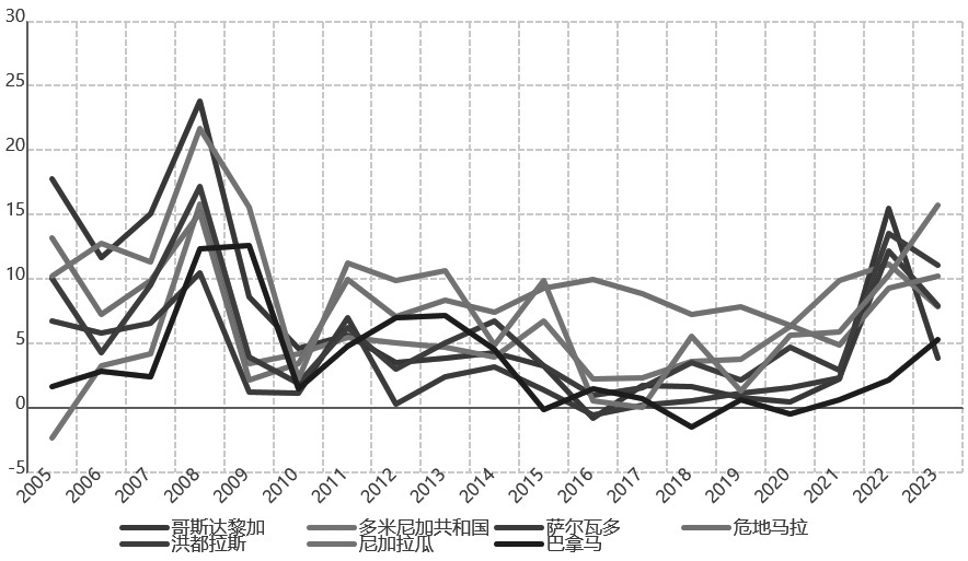 图为中美洲洲国家食品价格指数变化(2005—2023年)