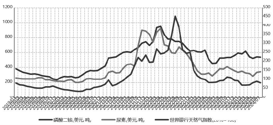 图为化肥和能源价格波动趋势(2019年1月—2024年7月)