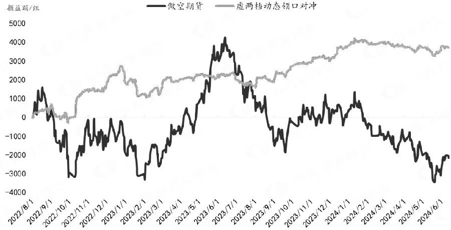图为甲醇绝对价格震荡上行 在上述行情上涨的情境下,从不同策略使用不同对冲方式的对比效果来看,抵补型策略在单边上涨行情中进行动态Delta中性调整后增加卖出虚值认沽期权头寸,增加对冲收益,而买保险类策略在该行情下若进行动态Delta中性调整,则会降低套保头寸,从而导致套保收益减少。另外,买保险策略和领口策略在该案例条件下的等市值对冲收益效果一样,而静态Delta中性对冲的买保险策略却比领口策略起到了更多对冲外的增强收益(相对期货),其原因是买保险策略的Delta变化在该行情中相对领口策略的Delta变化更加有利,即买保险策略有更大的正Gamma敞口。 从中长期角度来看,甲醇未来产能扩张受限,而传统下游与新兴下游持续投产,二季度面临春检带来的供应收缩、四季度面临天然气限气带来的进口缩量,阶段性单边上涨行情每年都会出现两轮。因此,可以在单边上涨行情中考虑固定买权数量并组合动态调整的卖权数量构建动态领口策略,以达到上涨行情中及时保护,而在下跌行情或不涨行情中能降低权利金支出,甚至能够获得权利金收入的对冲效果。 [动态调整对冲仓位] 若不考虑基差影响,下游采购企业采用传统的期货多头对冲方式后期现收益维持在零附近,即在对冲市场价格上行风险的同时舍弃了采购成本下跌的收益。而领口类策略由于卖出期权可以收取相应的权利金,不仅对冲了买入期权保险的权利金支出,甚至在不涨的行情中累积超额收益。因此,多倍卖权的领口类策略更适用于震荡上涨的行情。而伴随卖出认沽期权带来权利金收益的连带效应则是价格大幅下跌时多倍不利仓位带来的加倍风险,因此,为避免卖权仓位带来的尾部风险,需要保证整体期权头寸的价值变动与现货价格的敞口可控,使用动态Delta中性对冲则有效调整了期权整体持仓的价值变化,每隔一段时间就与期货价格变化回归1∶1的状态,避免了尾部风险的发展。 动态调整的具体步骤: 第一步,买入与现货头寸等面值的虚值两档认购期权,然后计算剩余Delta敞口,再卖出虚值两档认沽期权,其数量满足补足认购期权剩余Delta敞口的要求。举例说明,假设虚值两档认购期权的Delta=0.3,买入等面值认购期权合约之后,剩余Delta敞口为0.7,虚值两档认沽期权的Delta=0.25,则需要卖出0.7/0.25=2.8倍认沽期权头寸。 第二步,每隔一天重新计算期权组合头寸的Delta敞口,并通过调整卖出认沽期权的数量来平衡Delta,使得敞口回到零。 第三步,在期权合约到期当天或者期货价格变动10%时重新选择主力月份期权的虚值两档对应合约进行换仓交易。 第四步,为避免卖权头寸带来过多的保证金压力,设置卖出认沽期权头寸最多不超过现货市值的两倍。 按照上述步骤进行回测,并将动态领口策略组合与期货空头收益进行加总,用来展示该动态领口策略的对冲后表现,对比没有对冲策略的期货空头表现如下: