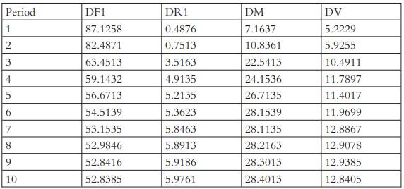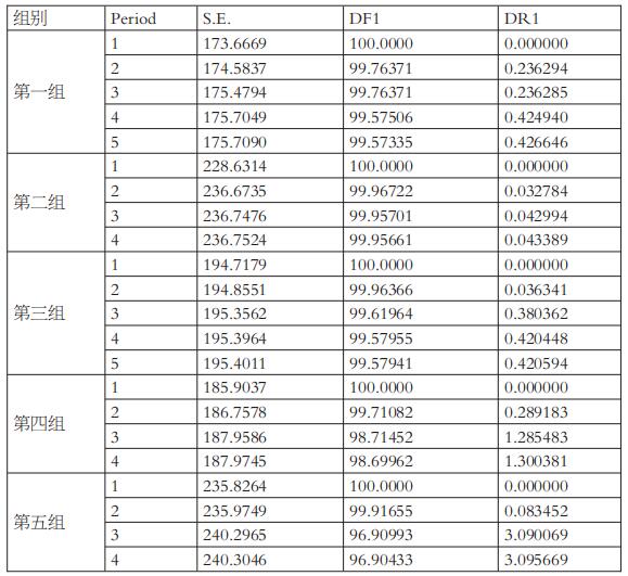 图3为单位根检验结果 建立稳定的VAR模型之后,我们通过图4可以看出,在5组数据中,除第2组数据显示,郑棉期价对于美联储利率在初始时期呈现出微弱的正向冲击反应外,其余4组数据结果均表明,郑棉期价对于美联储利率的变动先表现出负向的冲击结果,随后美联储利率再给郑棉期价一个正向的冲击作用,并且这种作用在5期之后逐步趋于衰退。这表明,在美联储调息的初期,大概率会对郑棉期价造成与利率变动方向相反的影响。即在加息初期,提高利率来抑制需求,棉价受利率影响宏观承压,价格略有走低;但由于加息通常发生在通货膨胀时期,叠加市场情绪消化的影响,故后期通货膨胀的影响开始在价格运行中得到体现,即在加息后期价格有所反弹。降息周期所引发的效果与加息周期相反,降息周期初期释放流动性,刺激投资和消费,棉价上涨。但在降息后期,经济低迷所引发的价格下跌局面便会显现。这表明,脉冲响应结果具有现实的经济学意义。